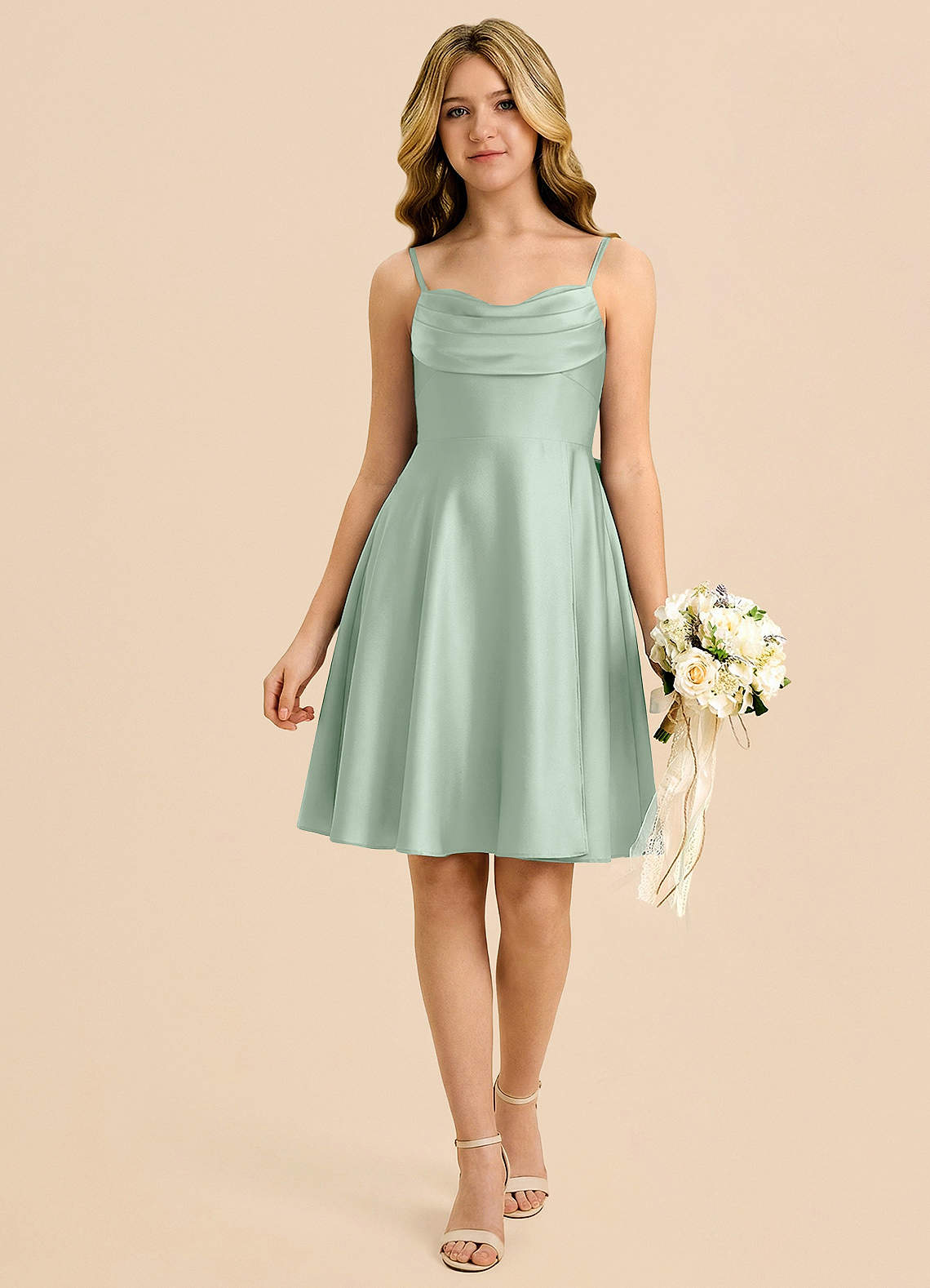 Azazie Bear Junior Robe Trapèze en Satin extensible Encolure en Forme de Cœur Agave image1
