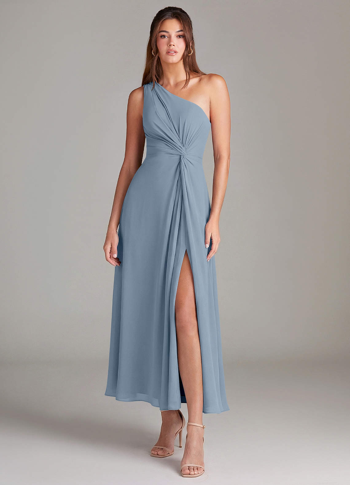 Robe Trapèze en Mousseline de soie Une épaule Bleu Poussiéreux