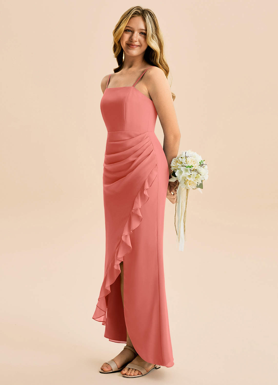 Robe Fourreau en Mousseline de soie Plissée Rose Saumon