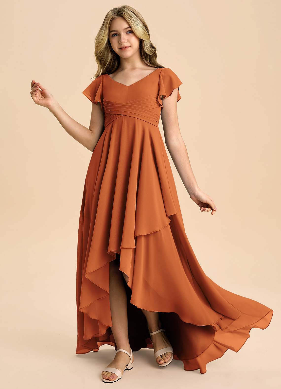 Robe Trapèze en Mousseline de soie Plissée Cannelle