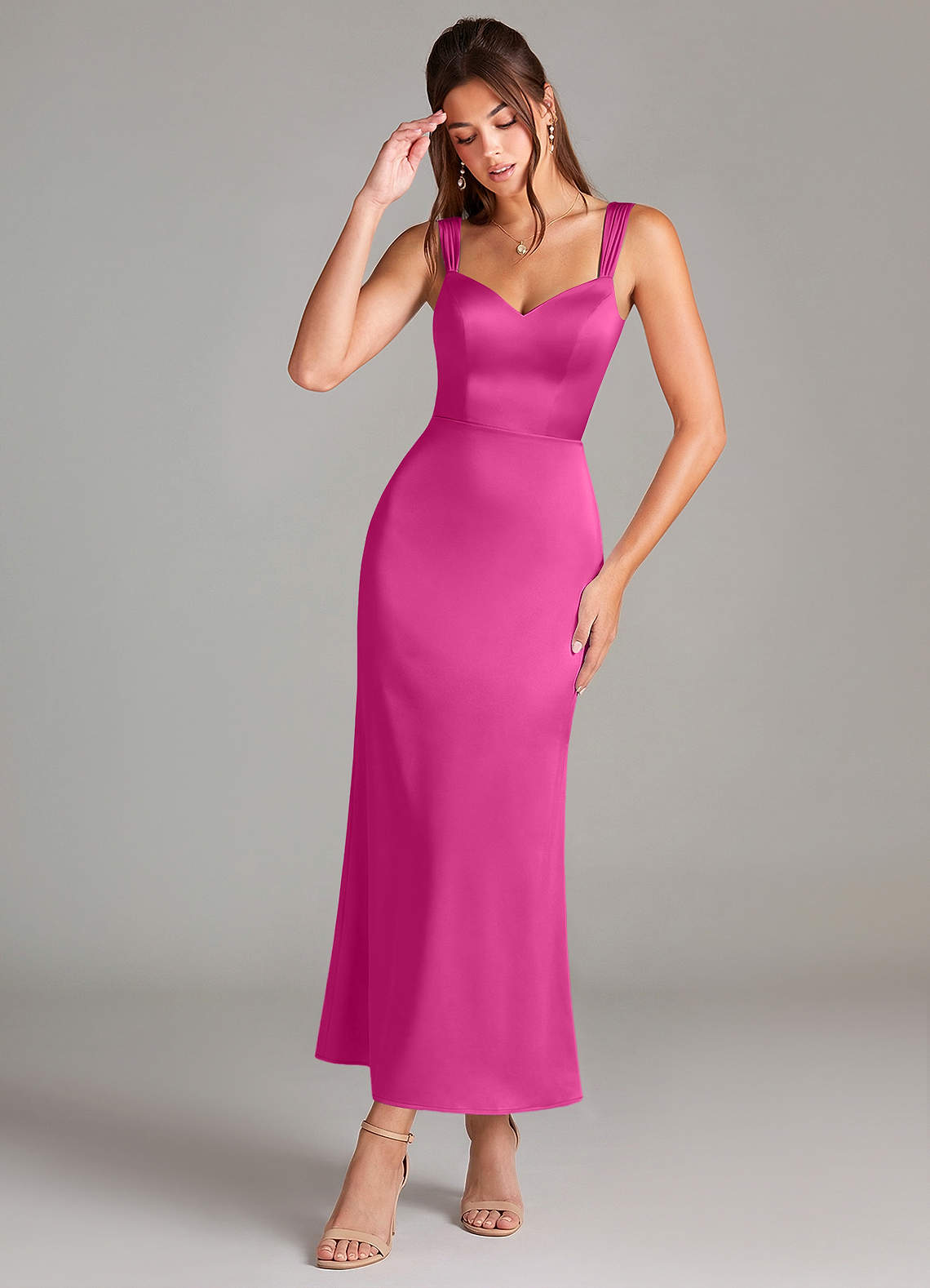 Robe Fourreau en Satin extensible Plissée Fuchsia