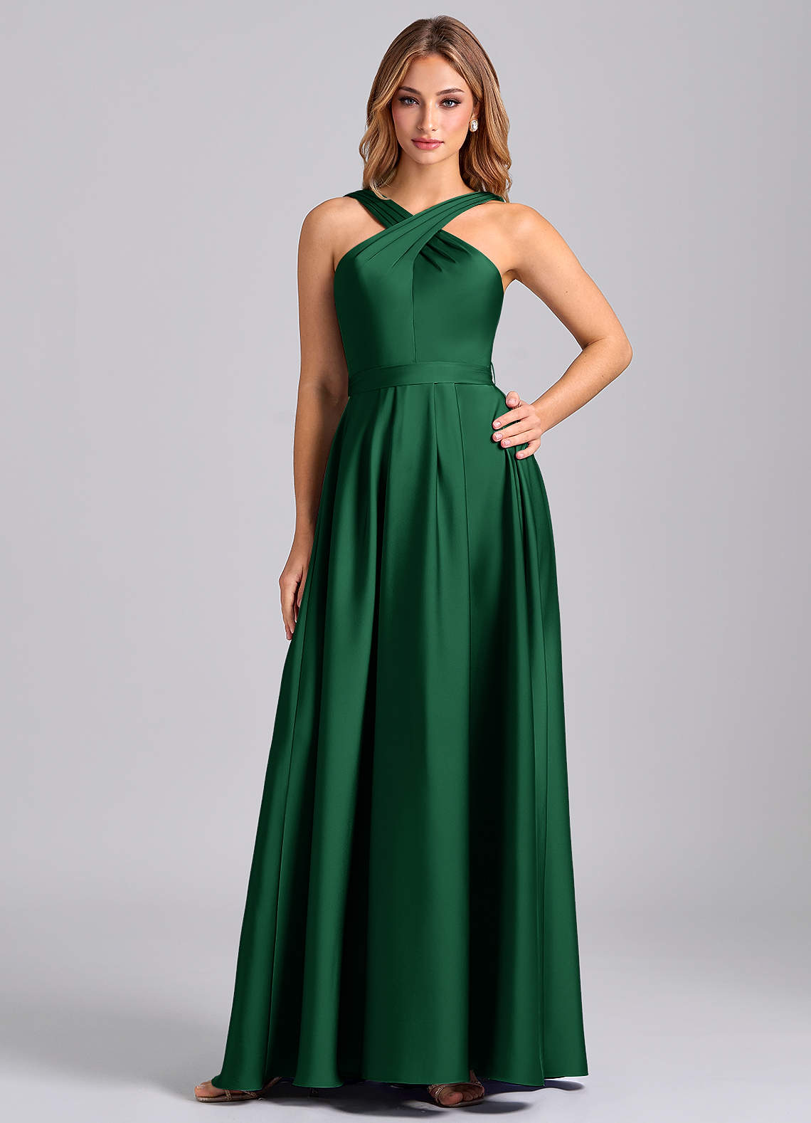 Robe Trapèze en Satin extensible Plissée Vert Foncé