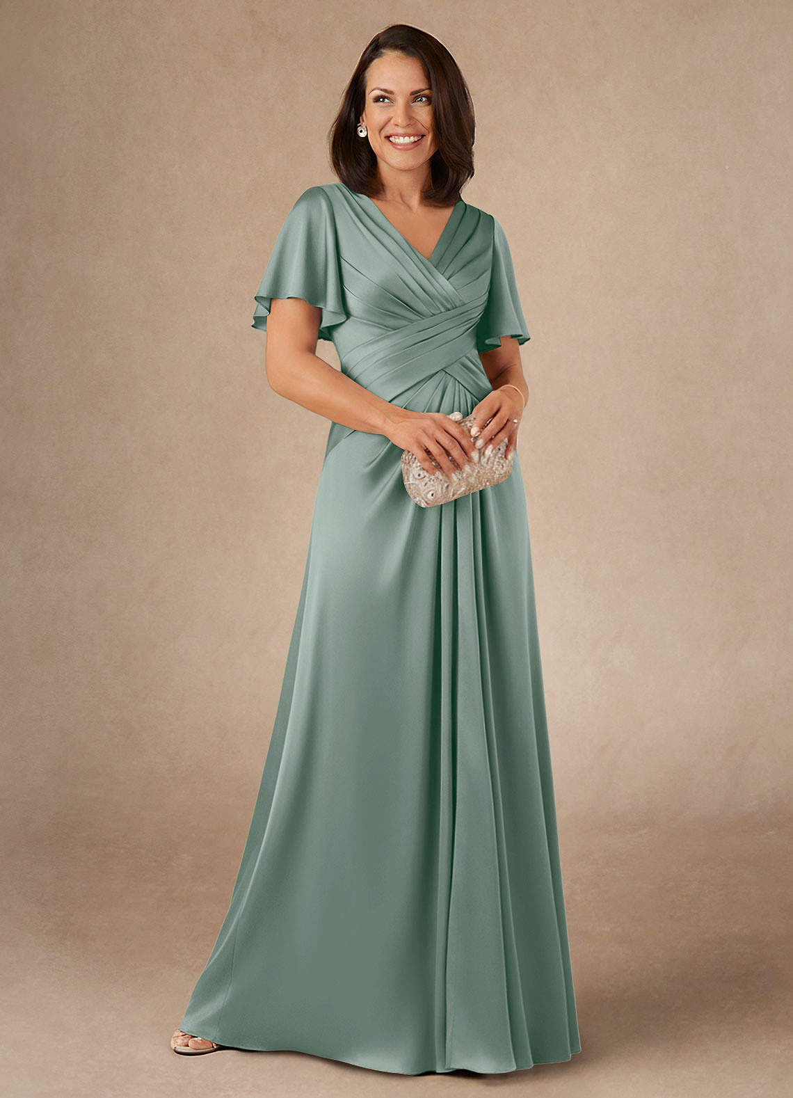 Robe Trapèze en Satin extensible Plissée Sauge D'argent