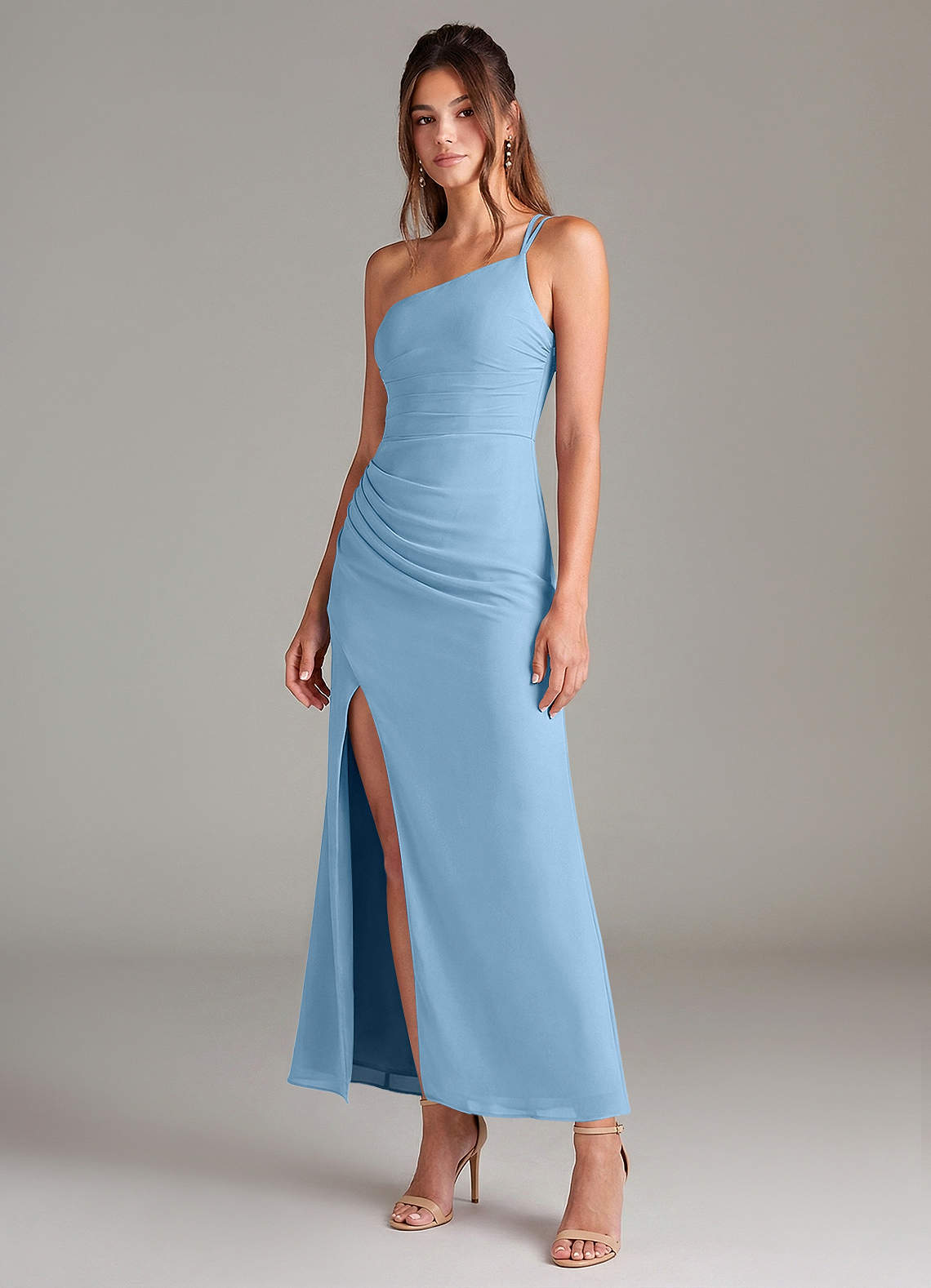 Robe Sirène en Mousseline de soie Une épaule Acier Bleuté