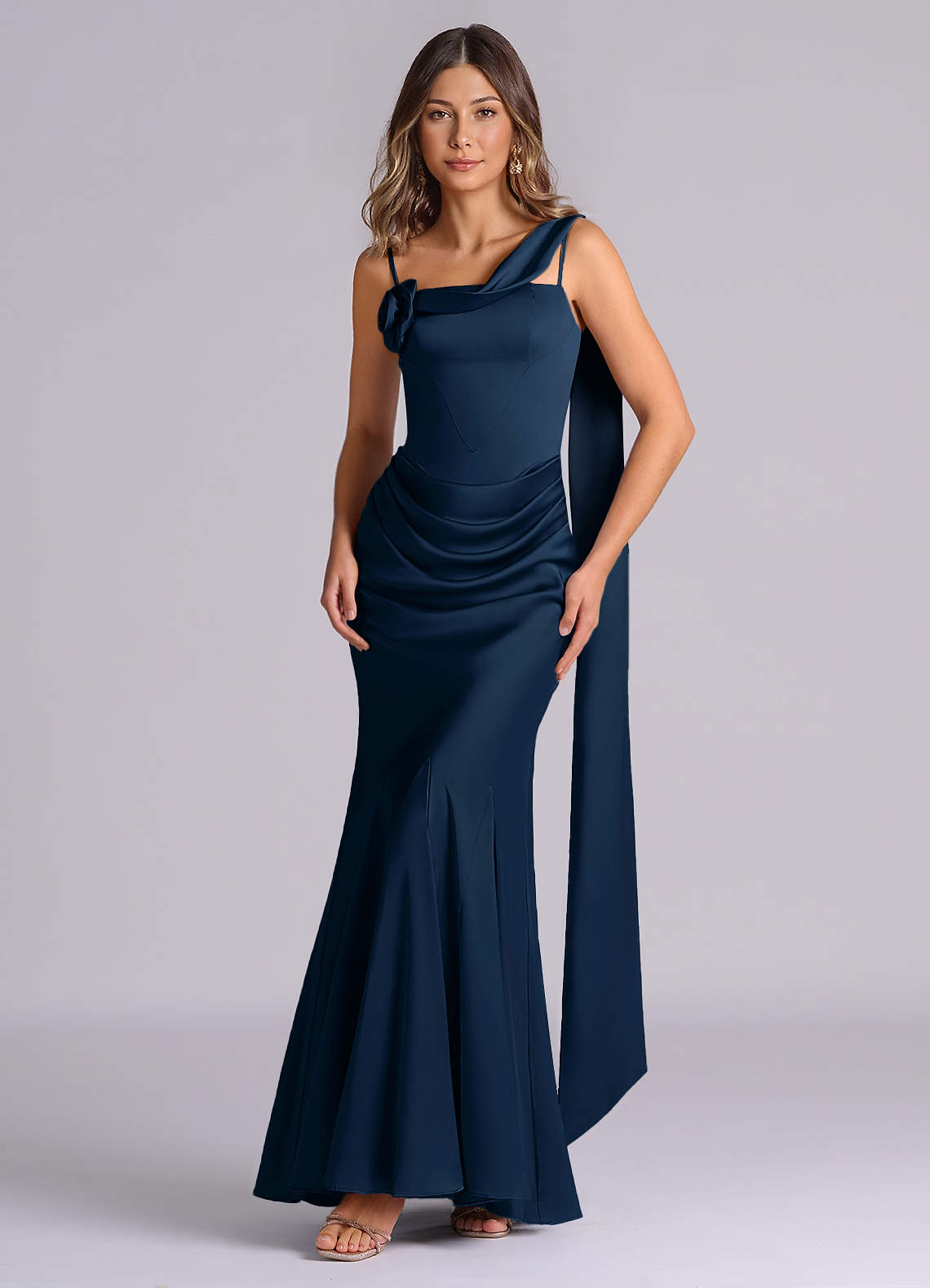 Robe Sirène en Satin extensible Plissée Bleu Marine Foncé