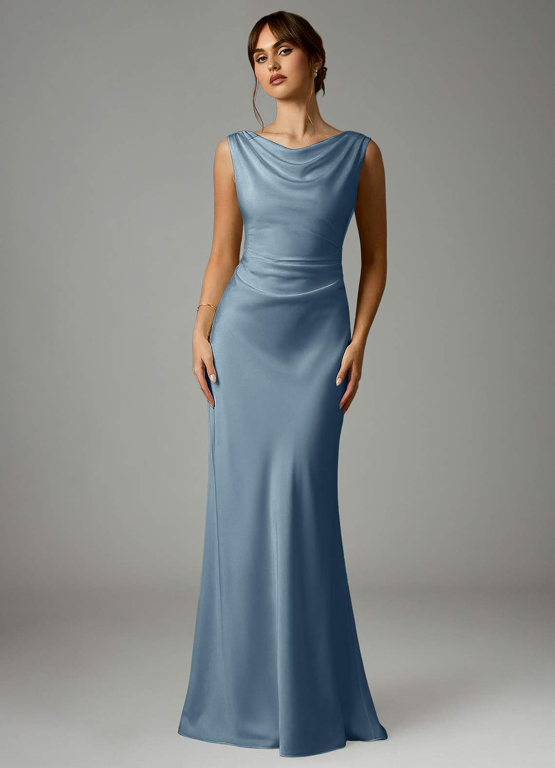 Robe Sirène en Satin extensible Plissée Bleu Poussiéreux