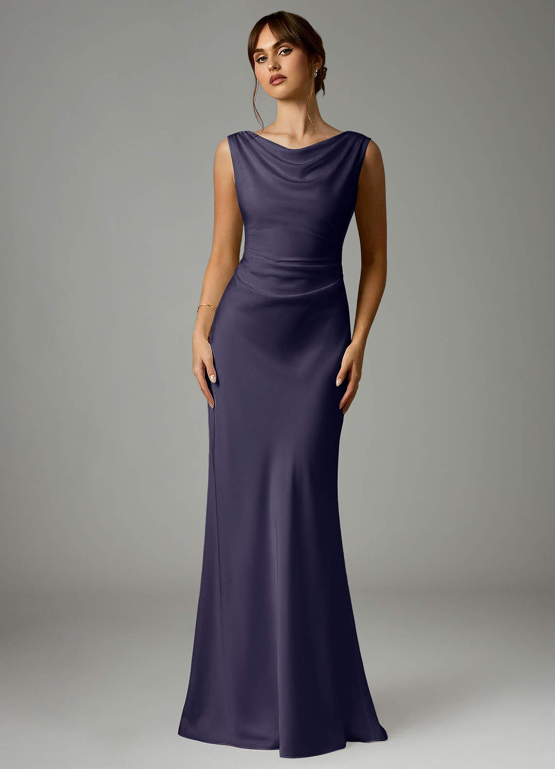 Robe Sirène en Satin extensible Plissée Bleu Orageux