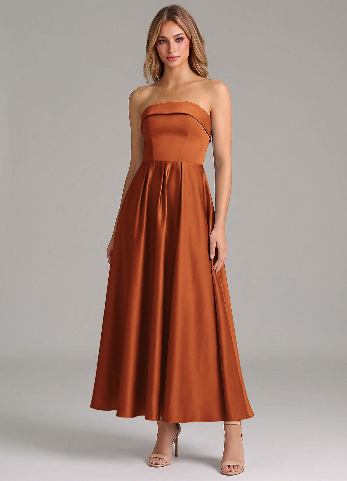 Robe Trapèze en Satin extensible Plissée Cannelle