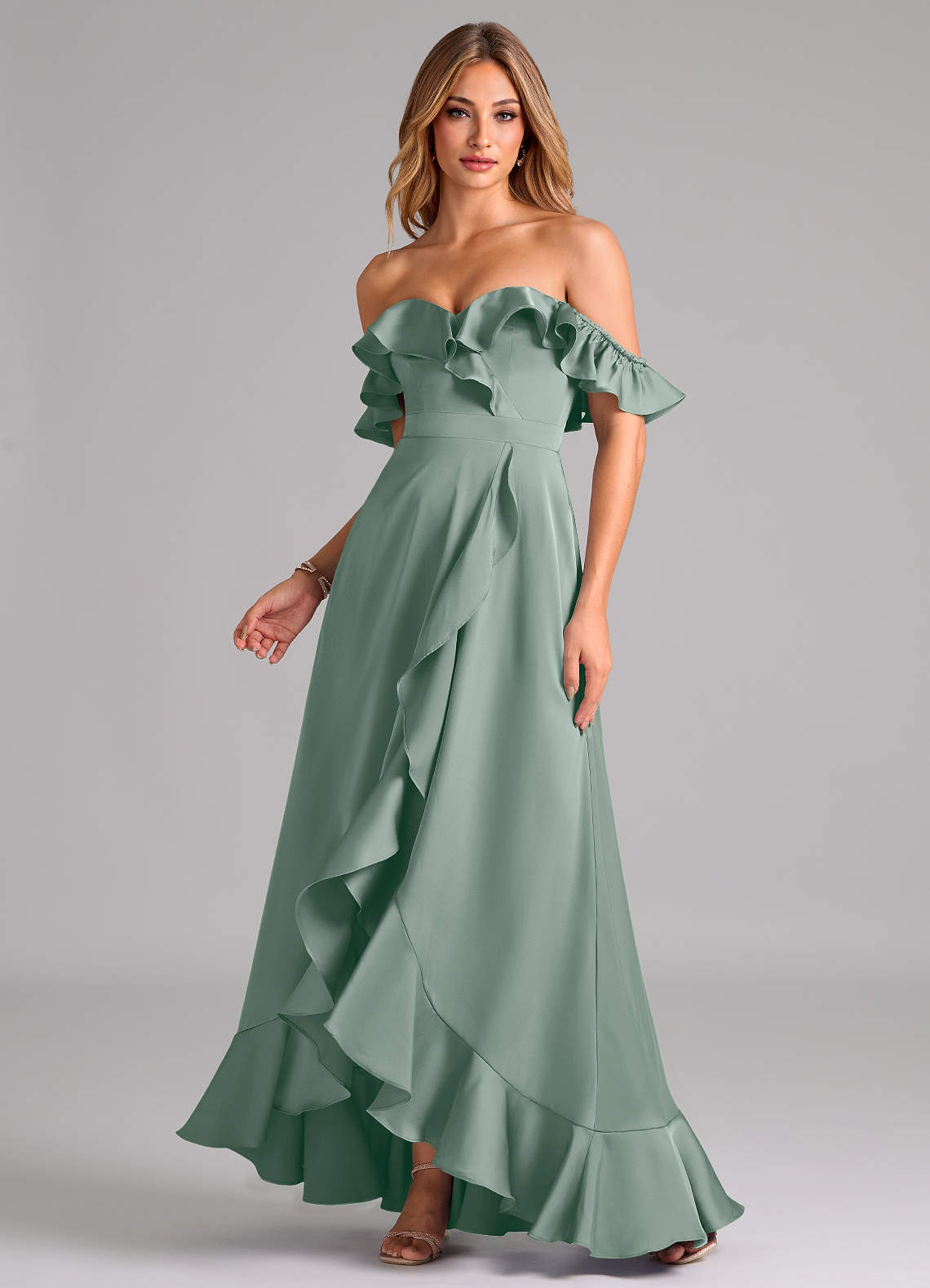 Robe Trapèze Convertible en Satin extensible Épaule décolletée Sauge D'argent