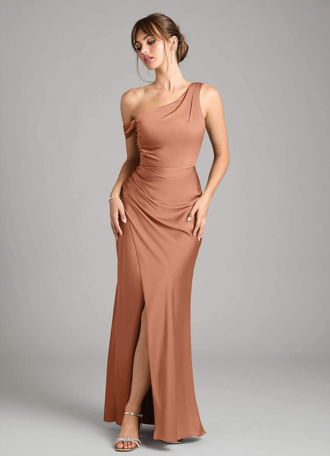Robe Sirène Convertible en Satin extensible Une épaule Bronze