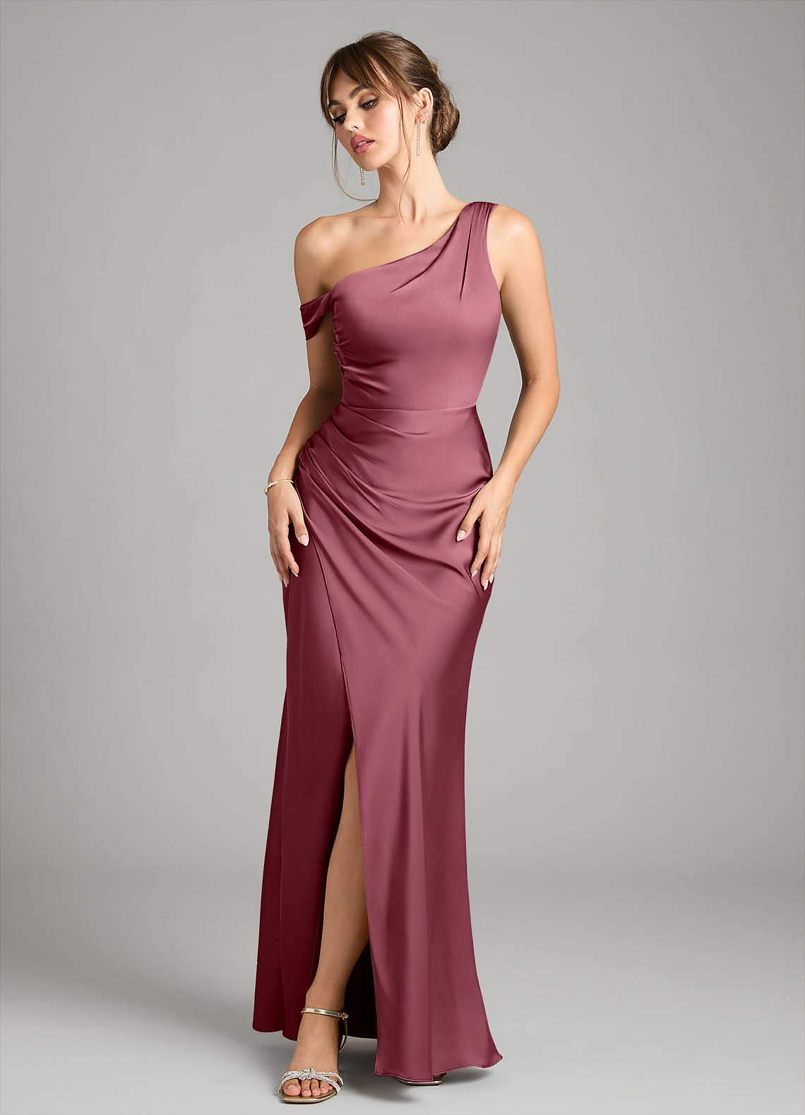 Robe Sirène Convertible en Satin extensible Une épaule Rose Du Désert