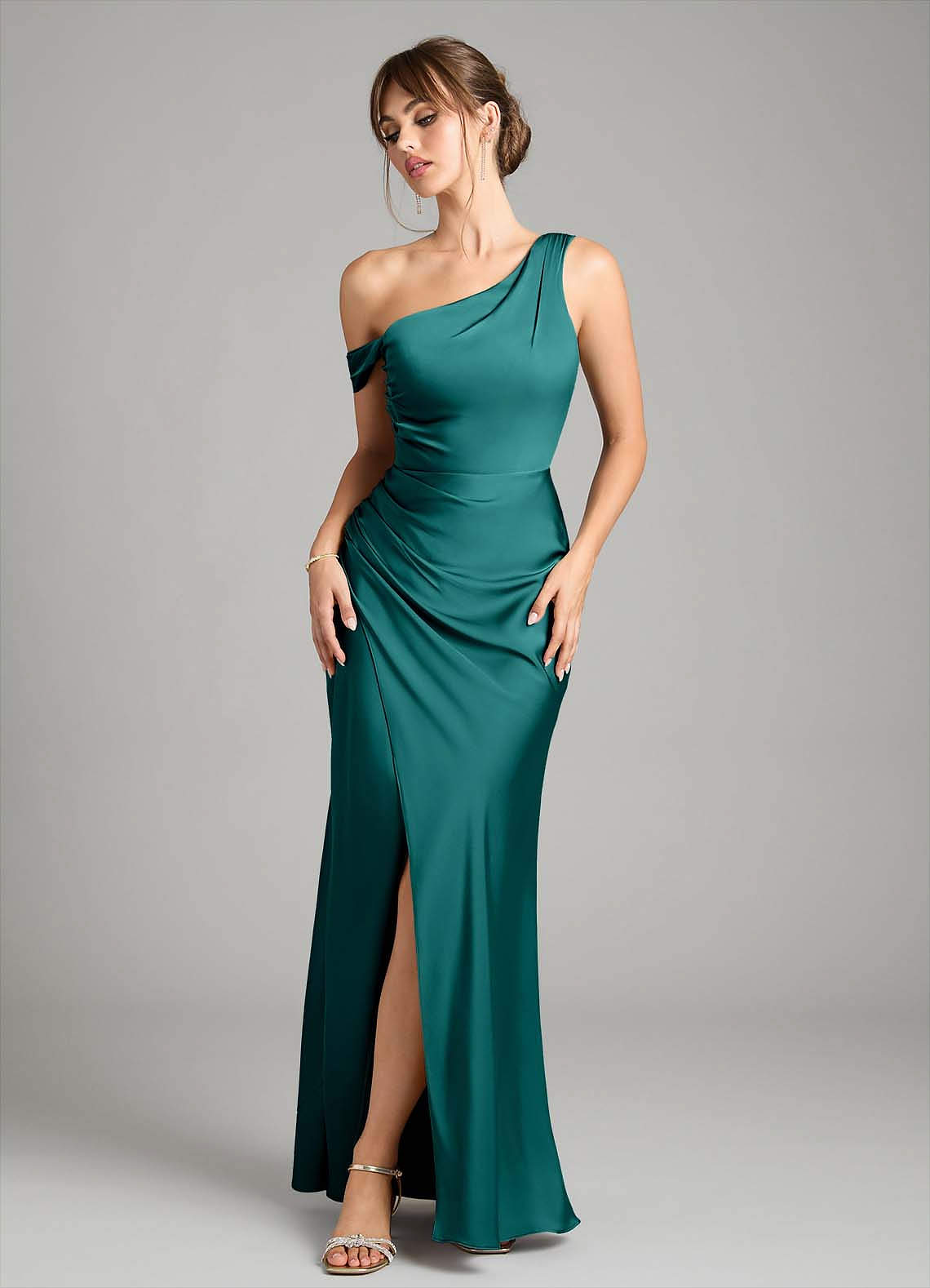 Robe Sirène Convertible en Satin extensible Une épaule Paon