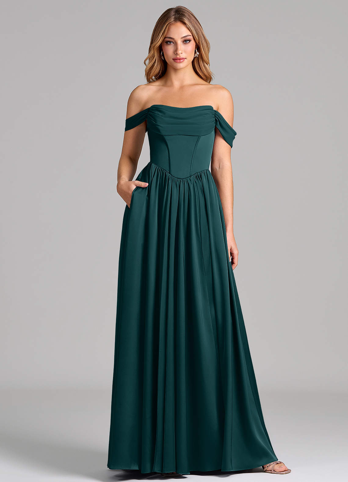 Robe Trapèze en Satin extensible Épaule décolletée Vert Pin