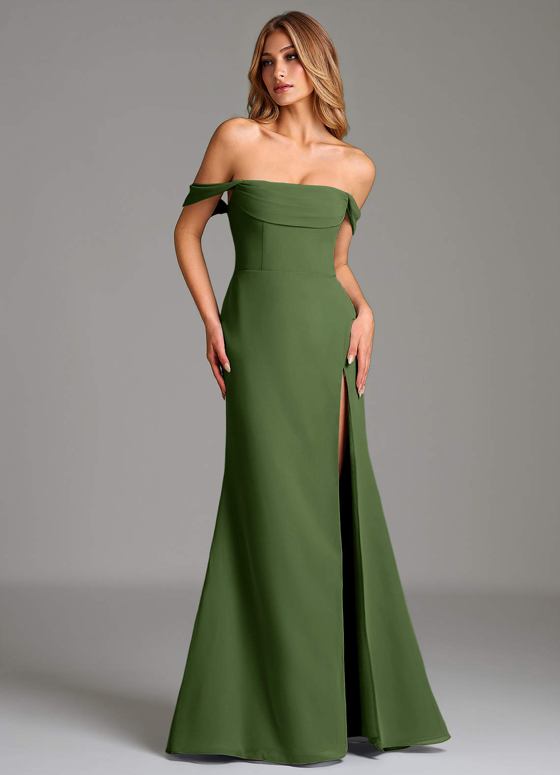 Robe Fourreau Convertible en Mousseline de soie Épaule décolletée Olive