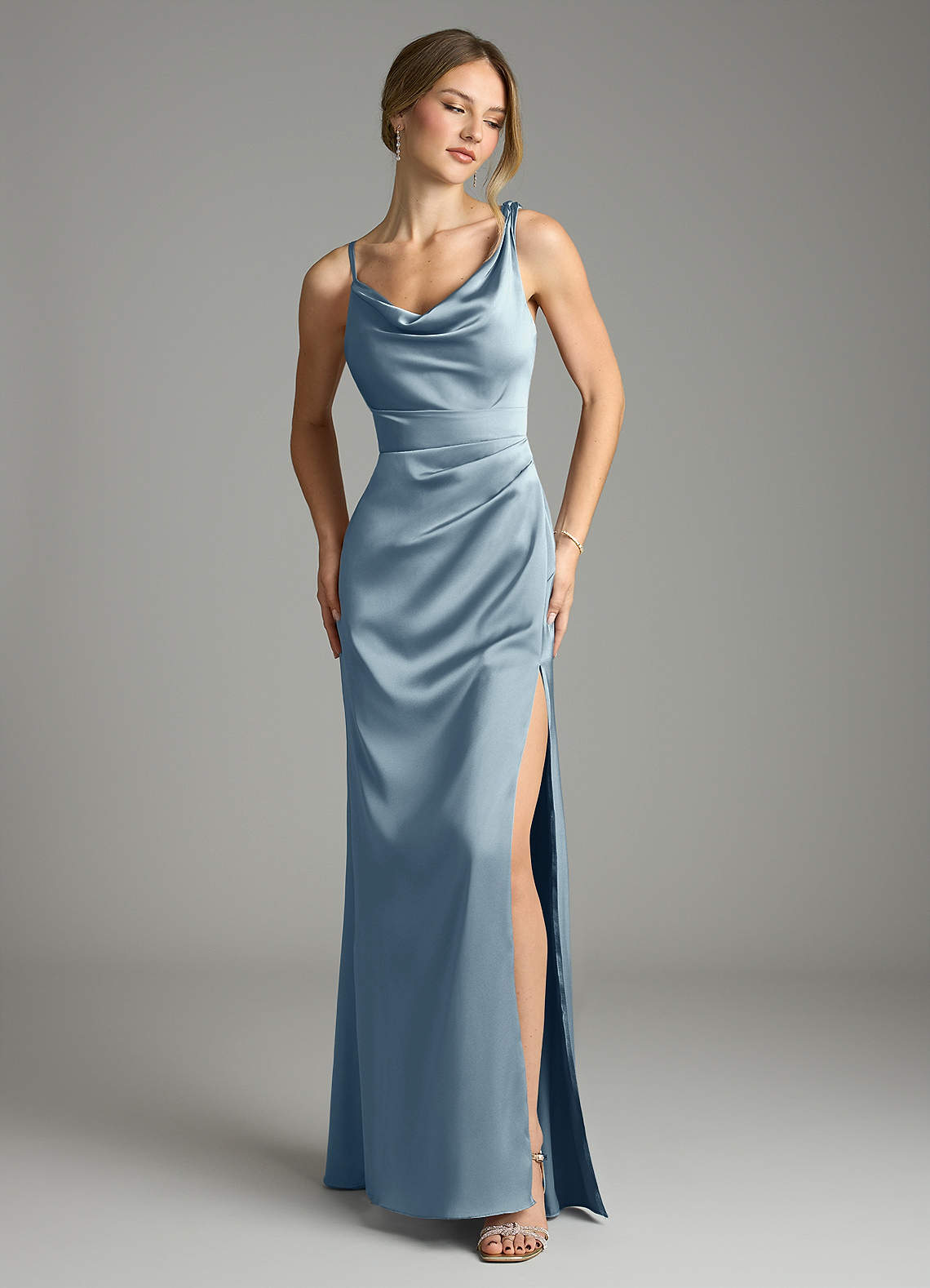 Robe Sirène en Satin extensible Plissée Bleu Poussiéreux