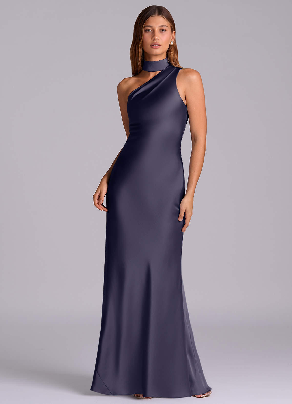 Robe Sirène en Satin extensible Une épaule Bleu Orageux
