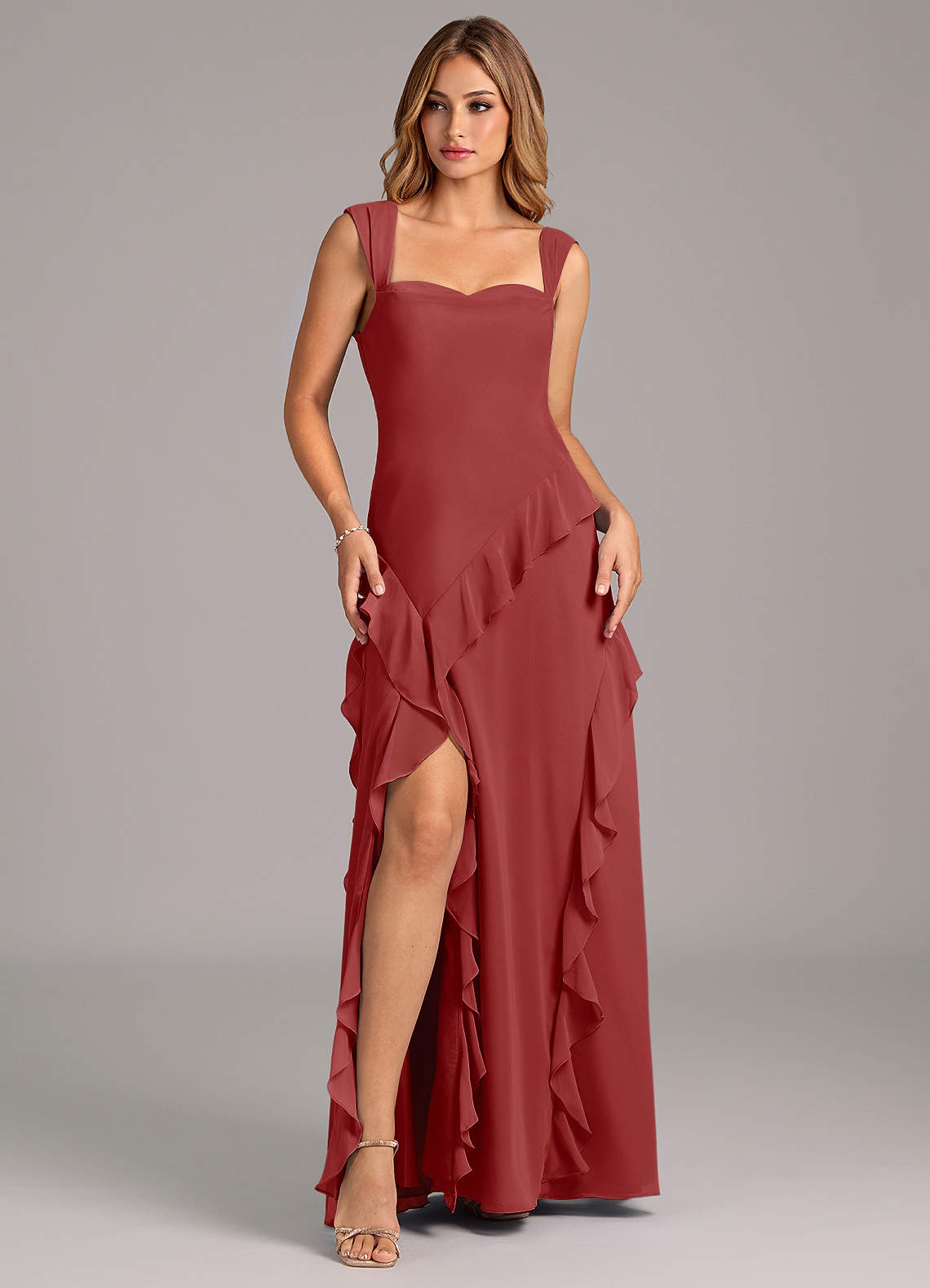 Robe Trapèze en Mousseline de soie Encolure en Forme de Cœur Rouille