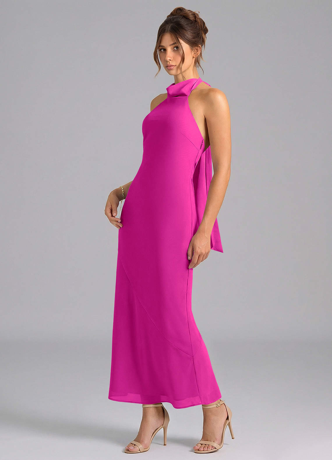 Robe Sirène en Mousseline de soie Col Haut Fuchsia