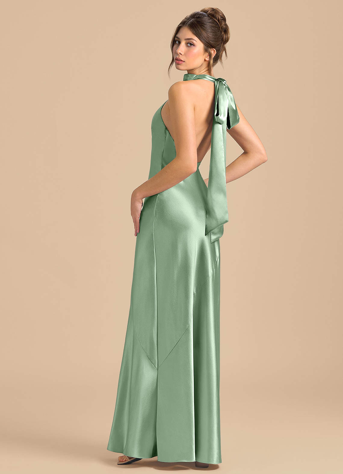 Robe Fourreau en Satiné métallisé Col Haut Matcha