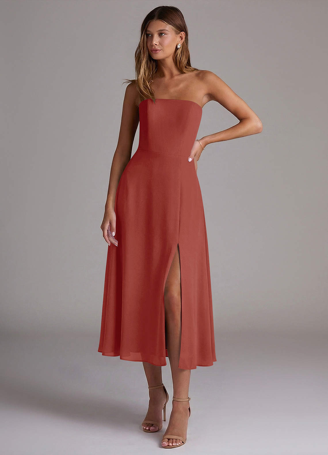 Robe Trapèze en Mousseline de soie Sans bretelles Terracotta