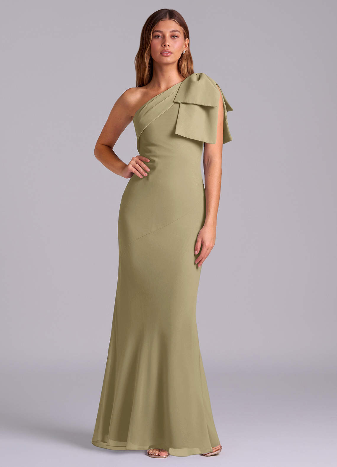 Robe Sirène en Mousseline de soie Une épaule Vert Mousse