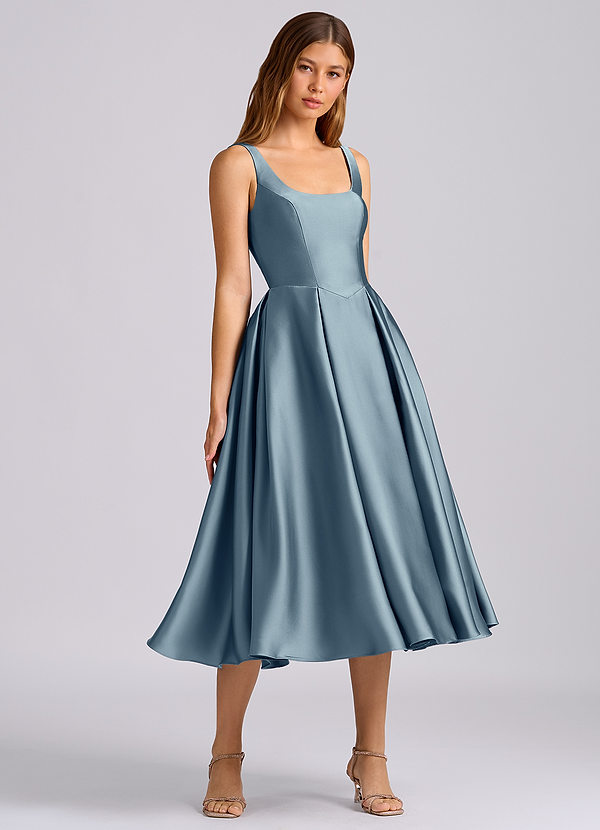 Dusty Blue A-Line Pleated Stretch Satin Dress