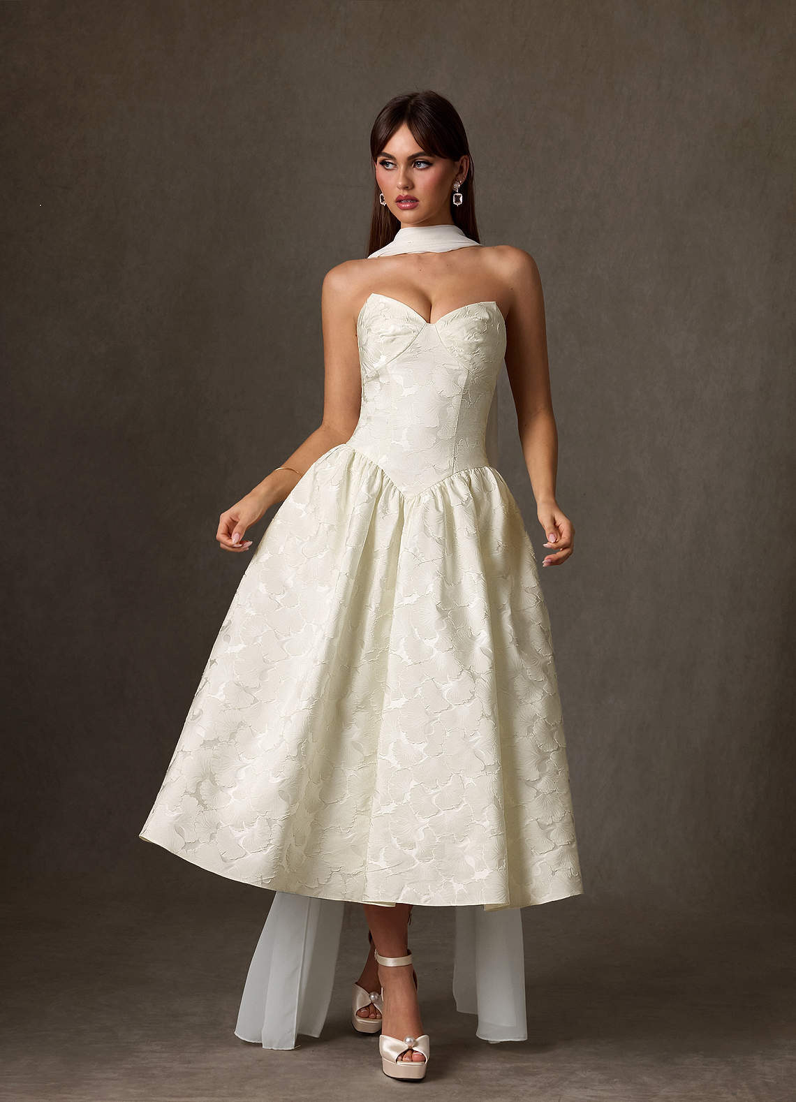 Cream A-Line Strapless Floral Jacquard Dress