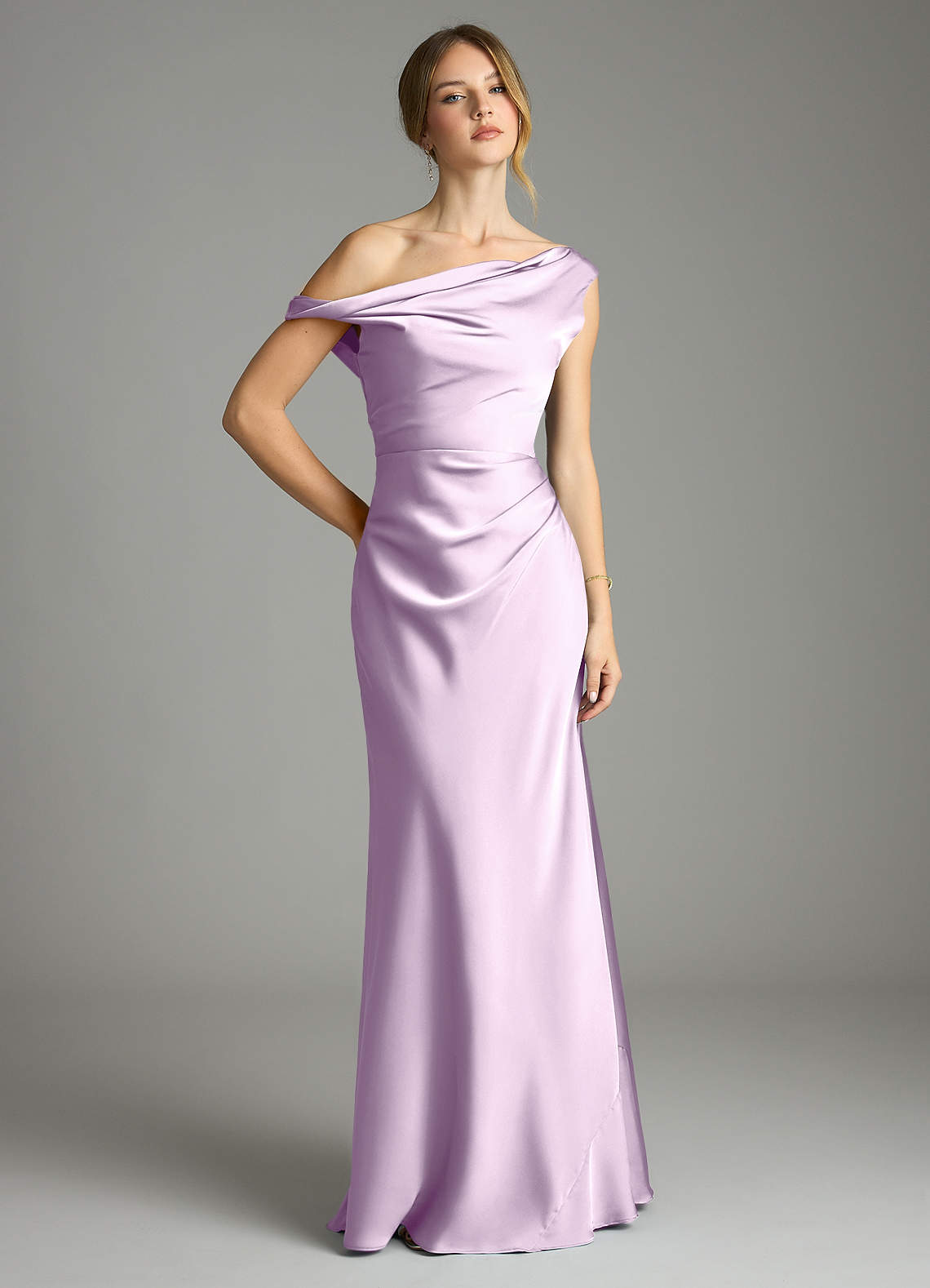 Frosted Lilac Mermaid Off the Shoulder Stretch Satin Dress