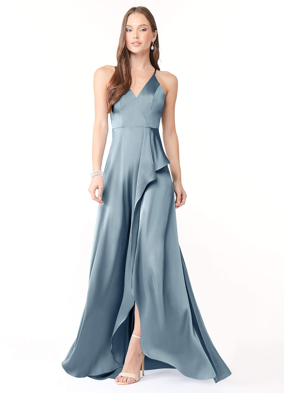 Dusty Blue A-Line Ruched Stretch Satin Dress