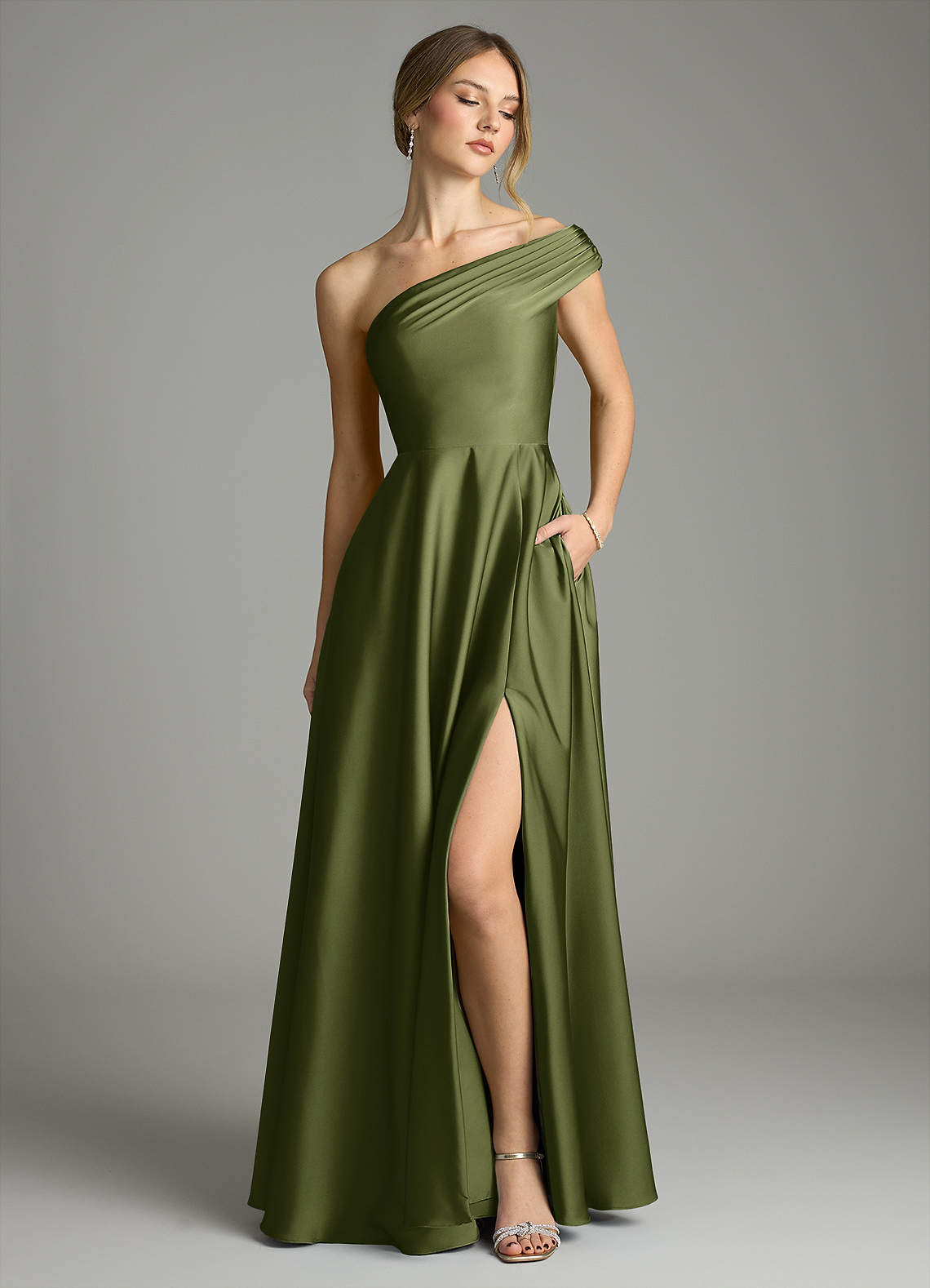 Olive A-Line Off the Shoulder Stretch Satin Dress