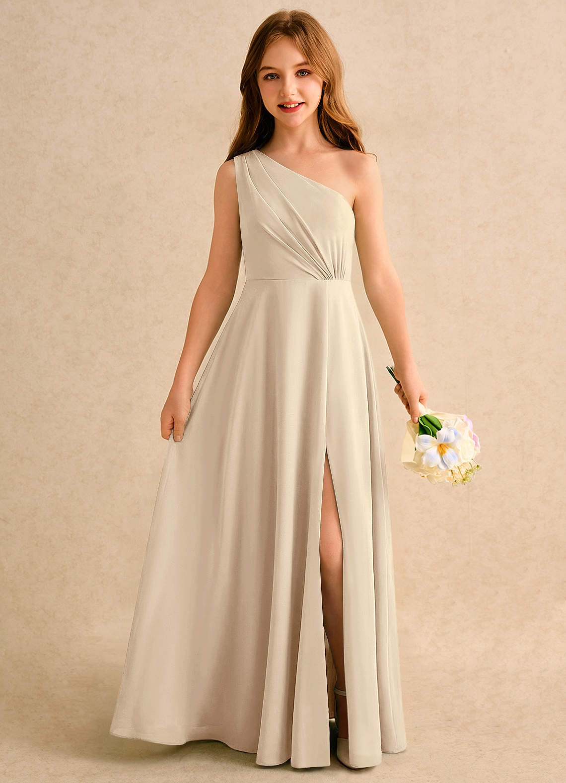 Champagne A-Line One Shoulder Chiffon Dress