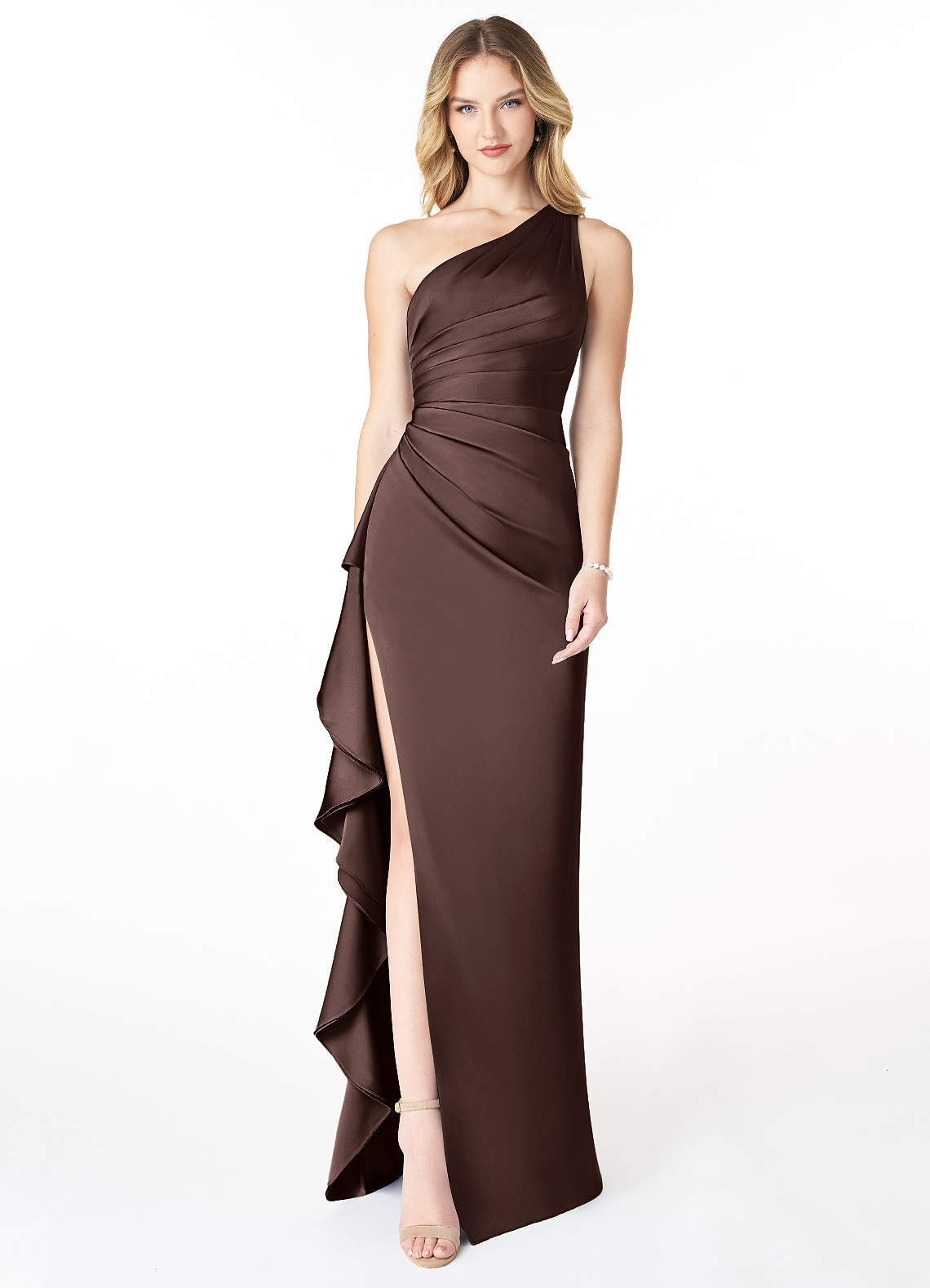 Black Sheath One Shoulder Cascading Ruffles Stretch Satin Dress