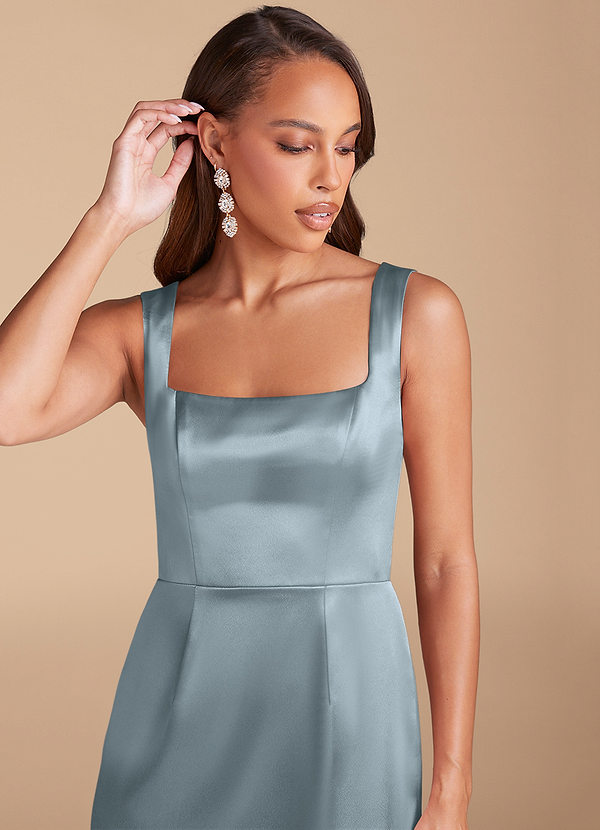 Dusty Blue Sheath Side Slit Metallic Satin Dress