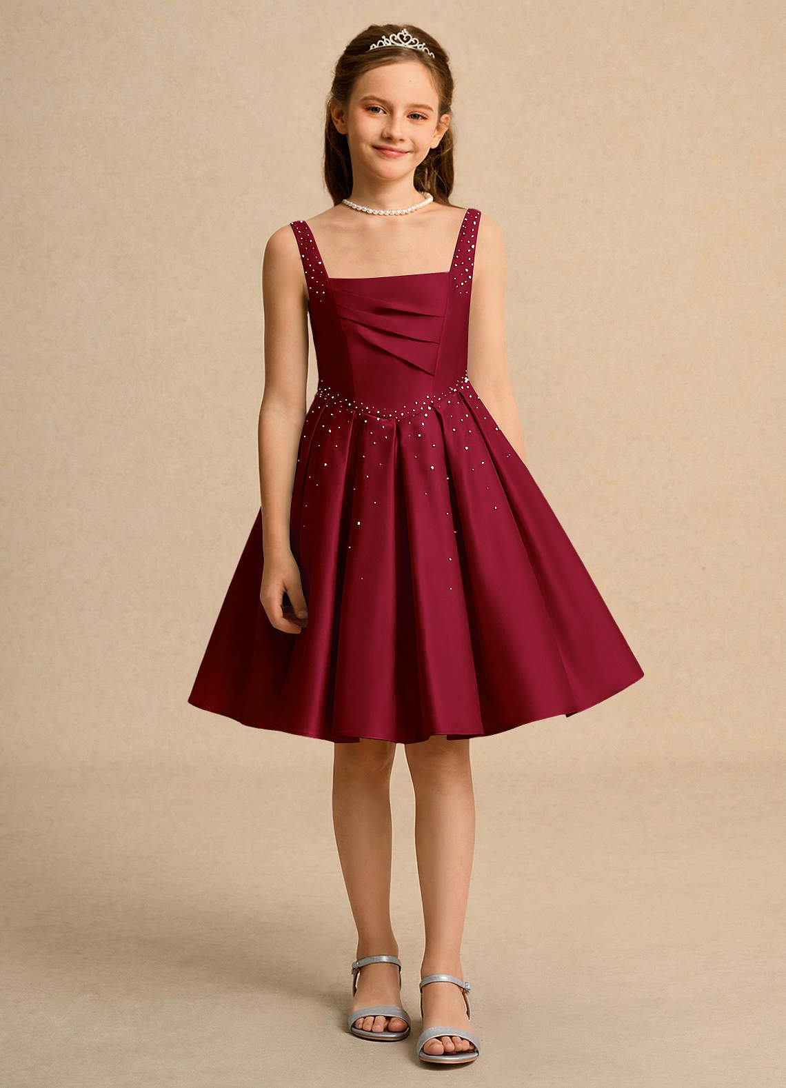 Burgundy Ball-Gown Pleated Matte Satin Dress