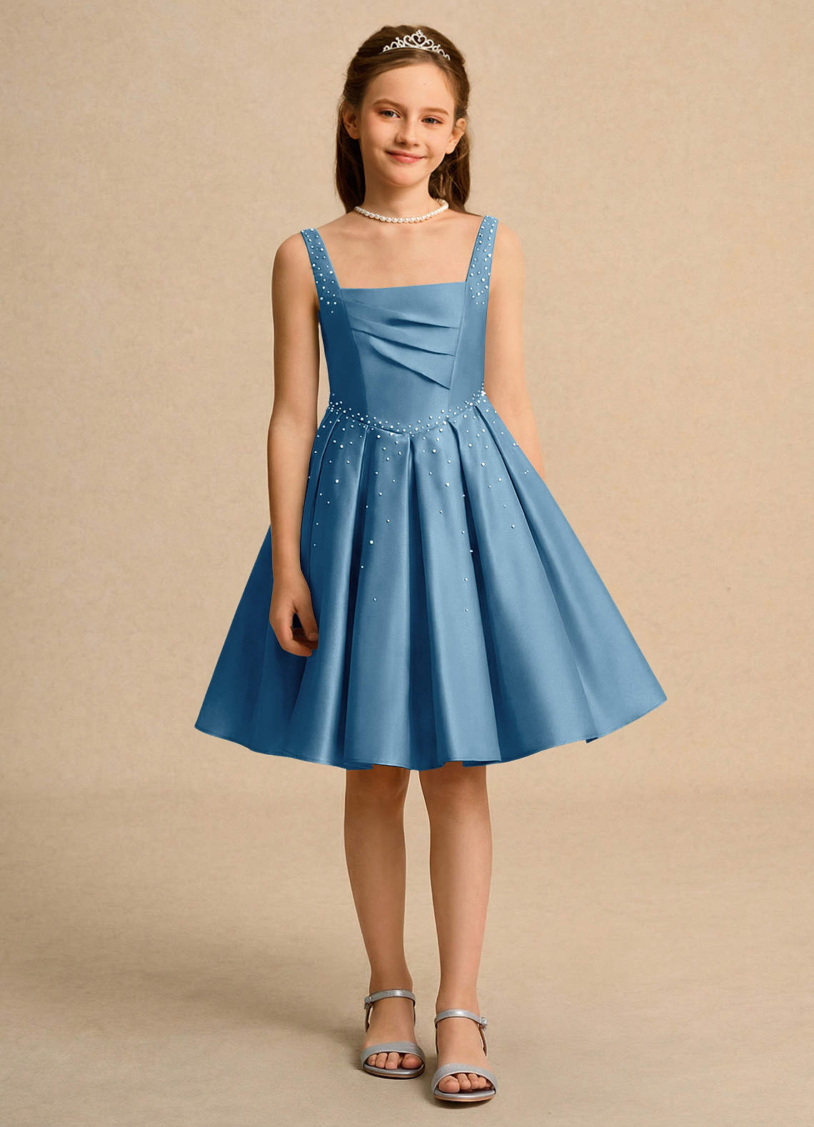 Steel Blue Ball-Gown Pleated Matte Satin Dress