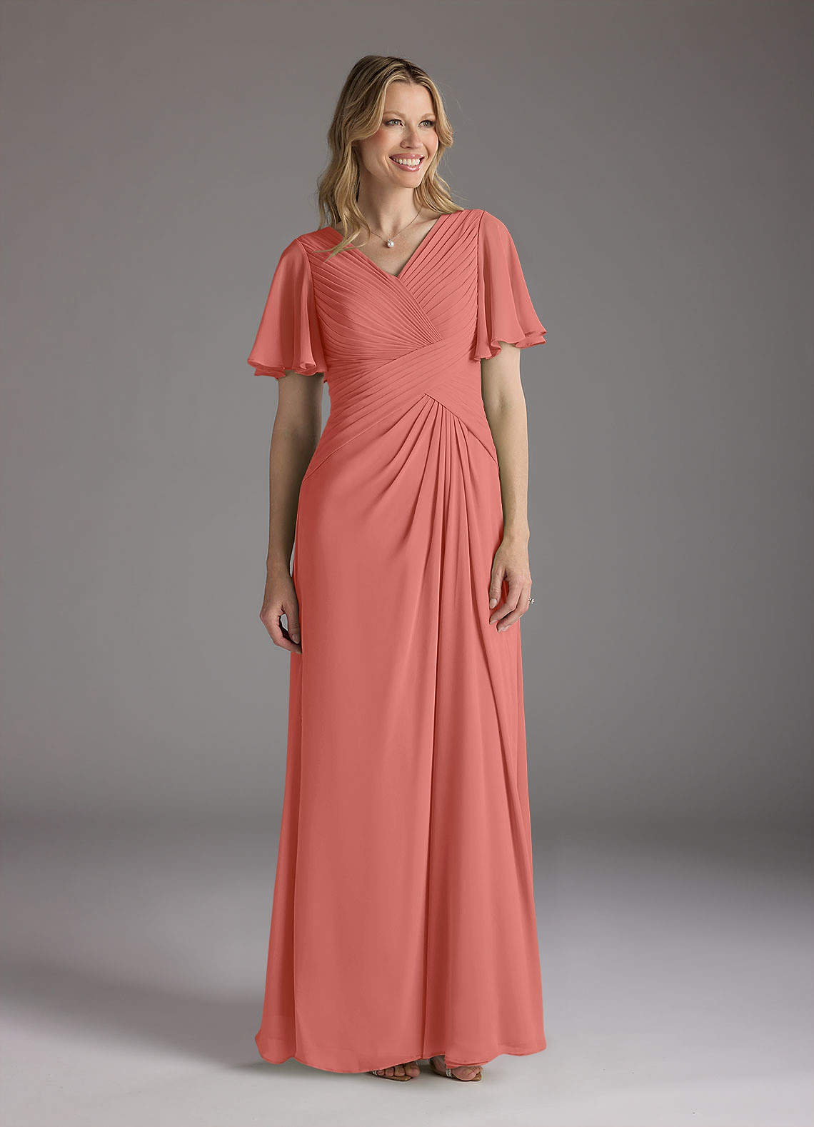 Salmon Pink A-Line V-Neck Ruched Chiffon Dress