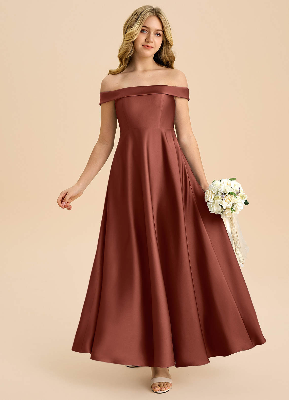 Auburn A-Line Off the Shoulder Stretch Satin Dress