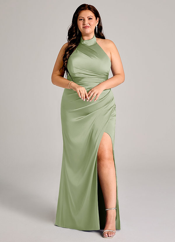 Abito Sirena in Raso Elasticizzato Collo Alto Verde Salvia