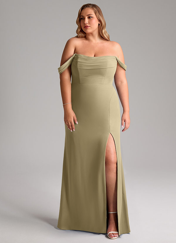 Abito Sirena in Raso Elasticizzato a Spalla Scoperta Verde Muschio