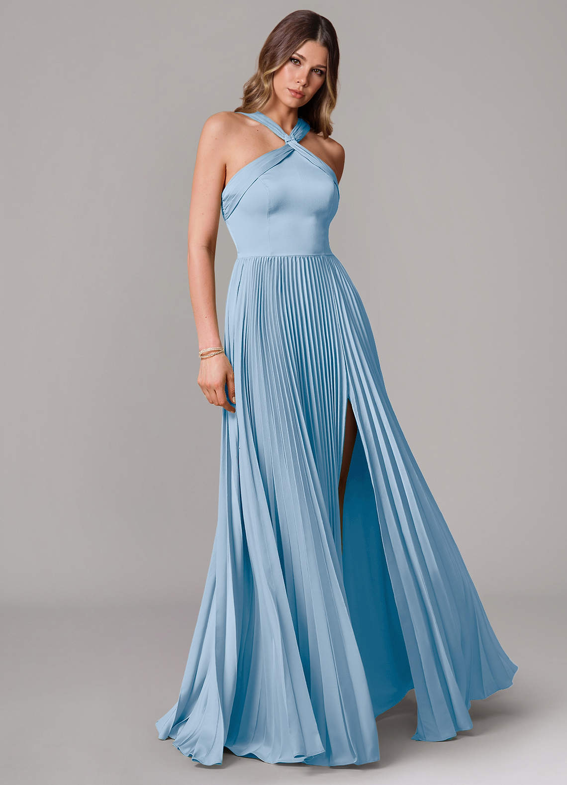 Abito A-Line in Raso Elasticizzato Plissettato Azzurro Polvere