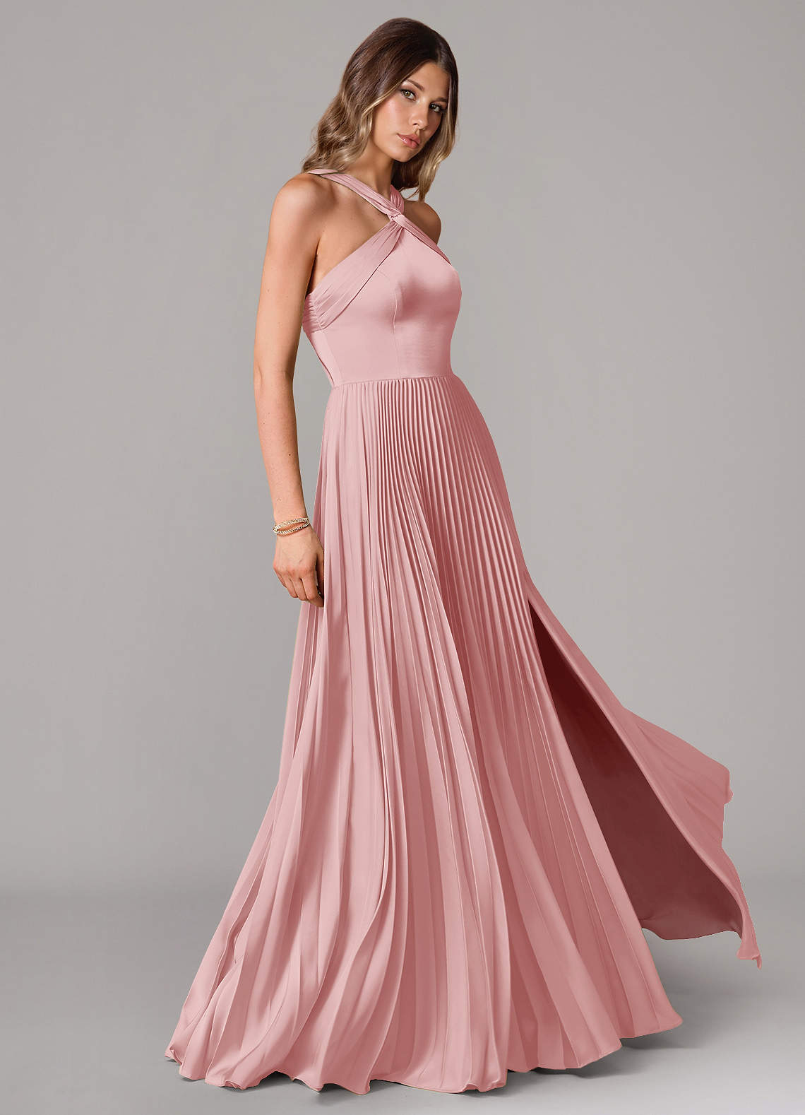 Abito A-Line in Raso Elasticizzato Plissettato Rosa Cipria