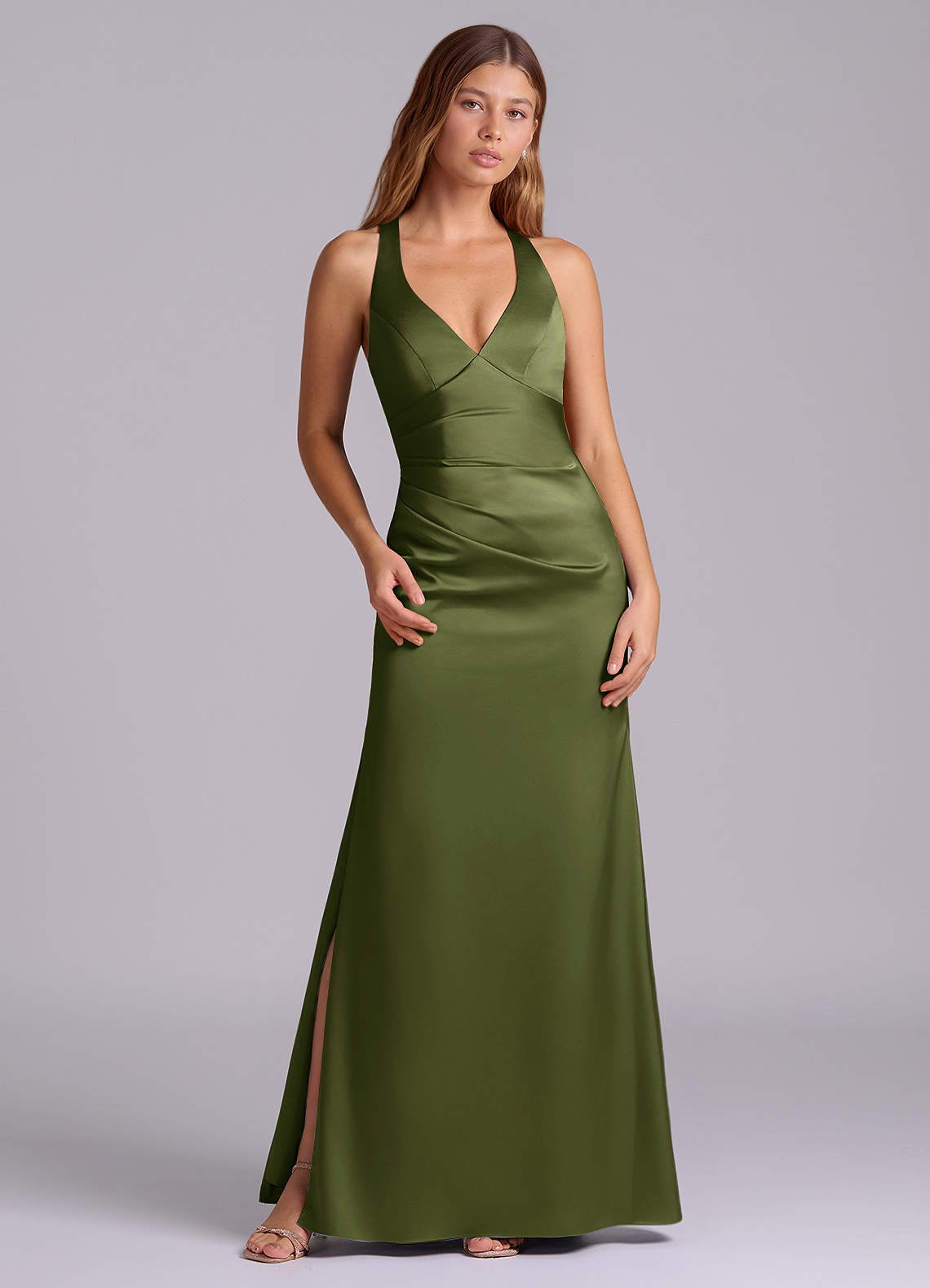 Abito A-Line in Raso Elasticizzato Plissettato Oliva