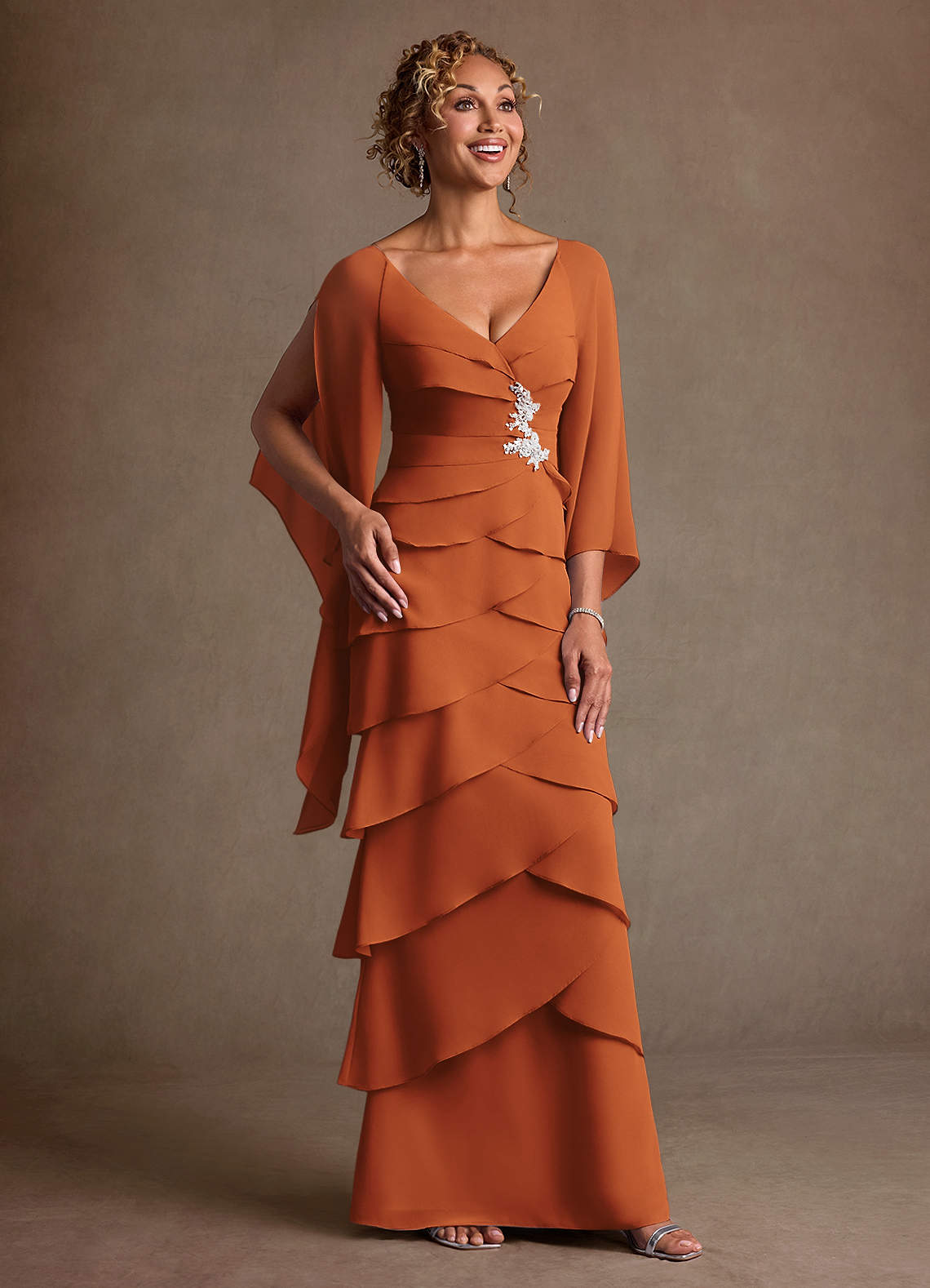 Abito Tubino in Chiffon Increspato Cannella