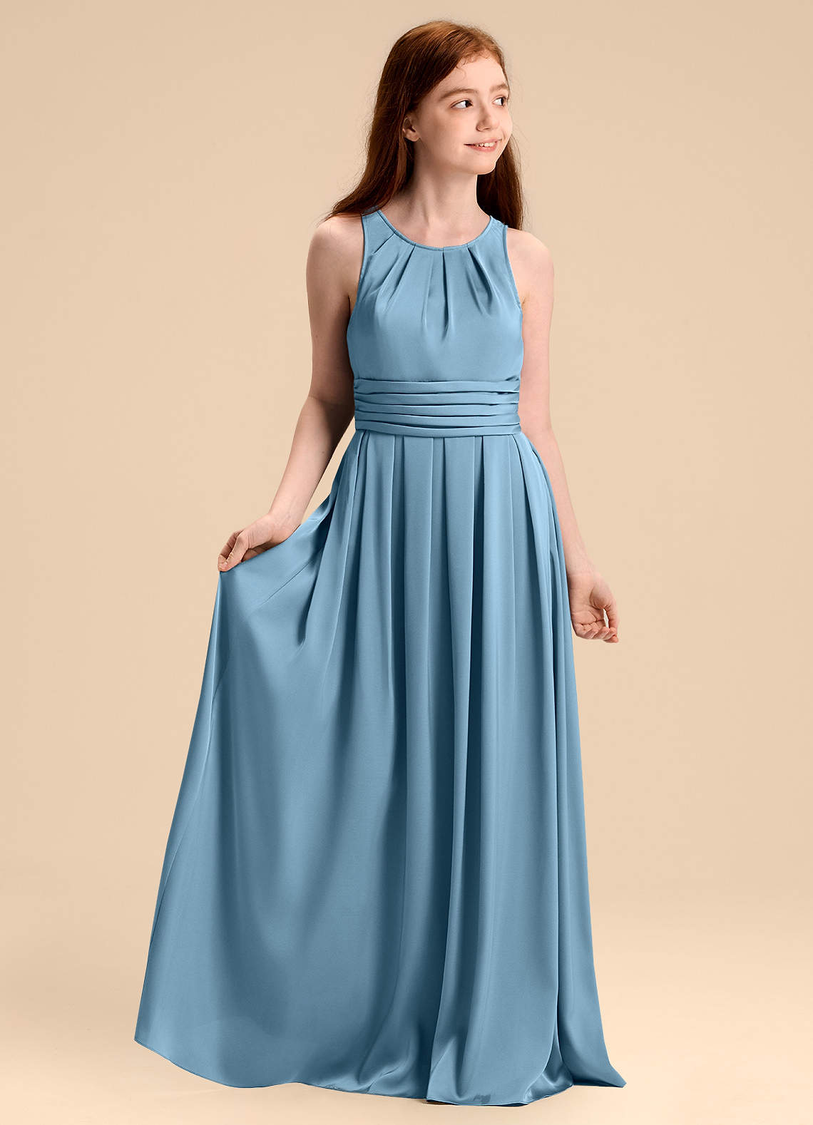 Abito A-Line in Raso Elasticizzato Plissettato Blu Acciaio