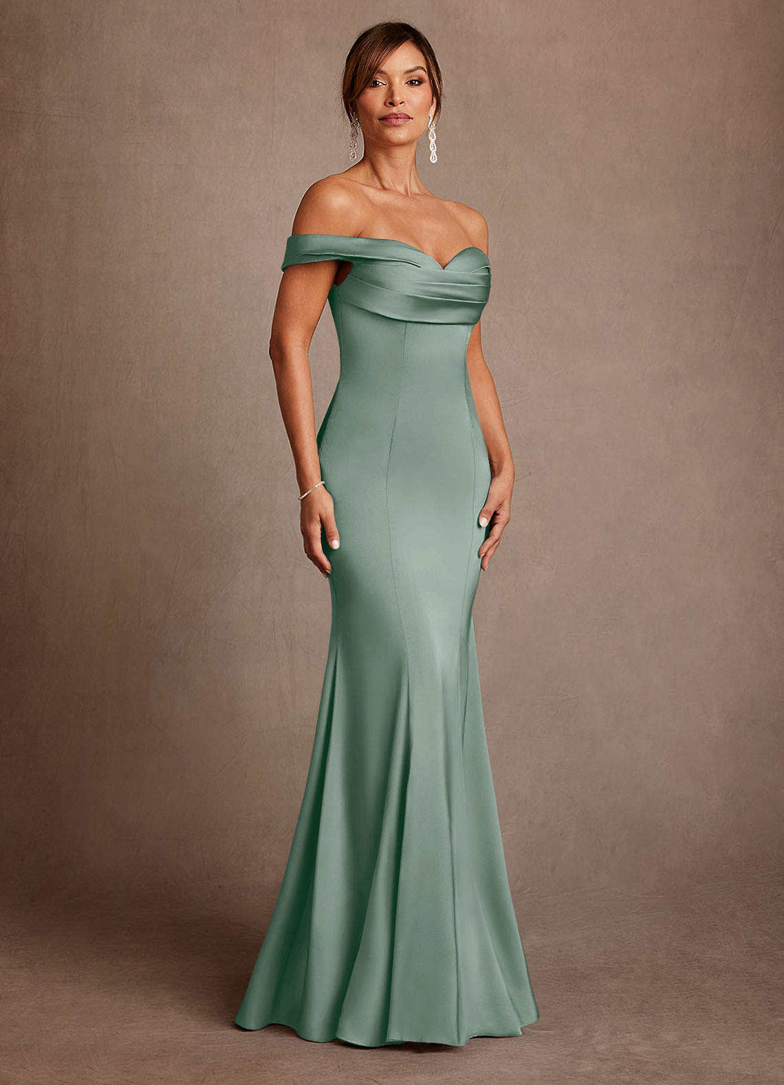 Abito Sirena in Raso Elasticizzato a Spalla Scoperta Salvia Argentata