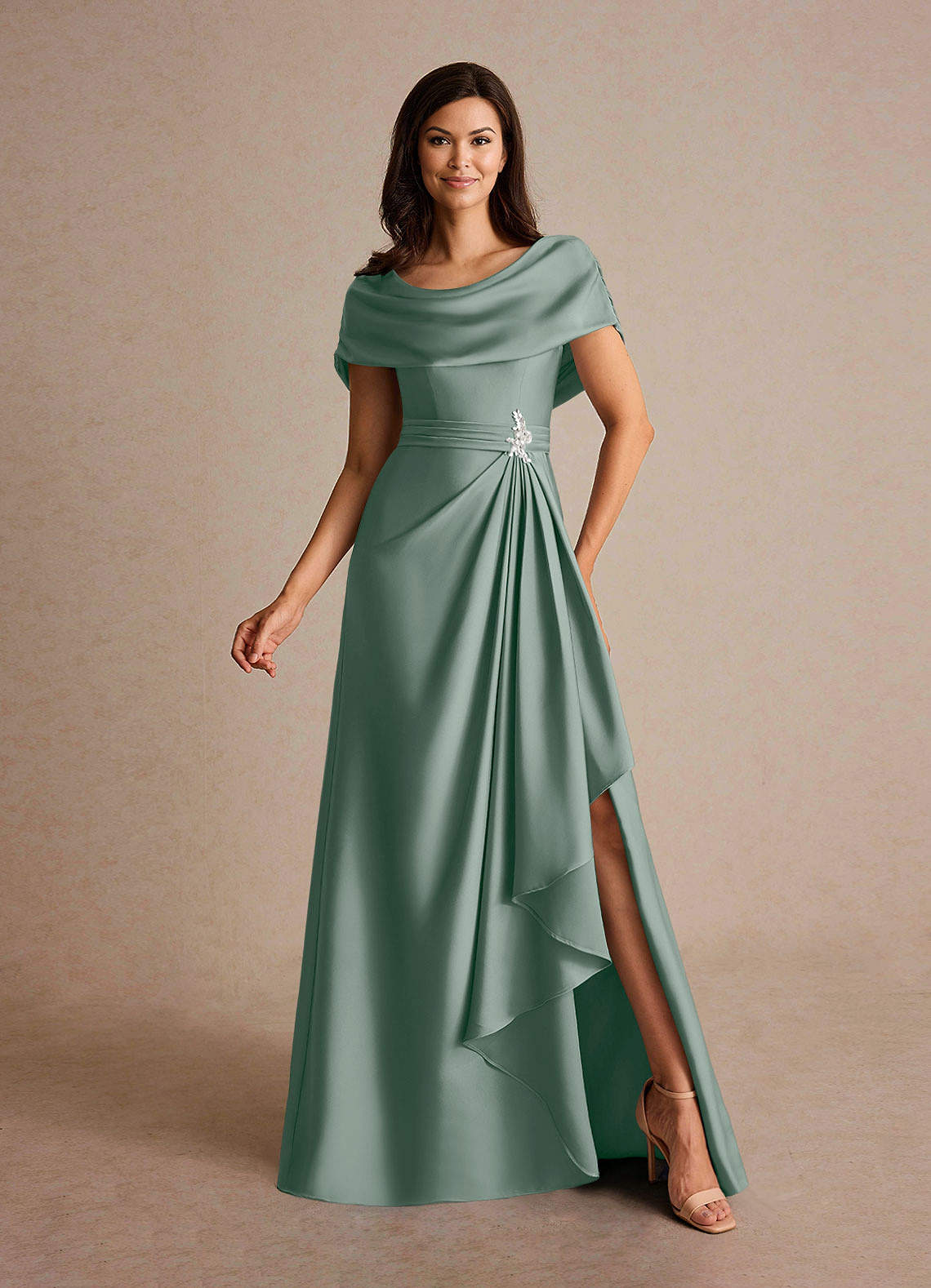 Abito A-Line in Raso Elasticizzato Plissettato Salvia Argentata