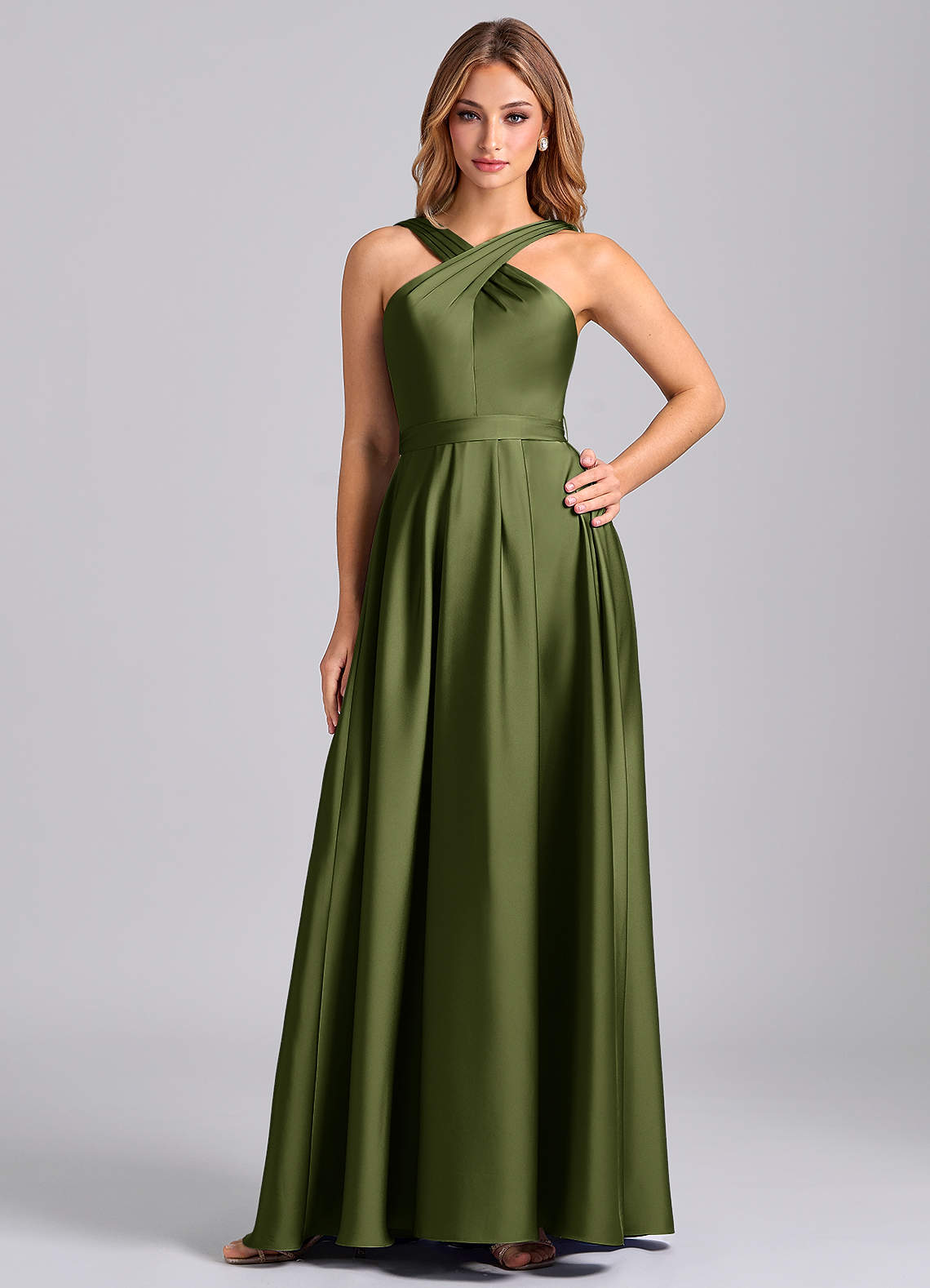 Abito A-Line in Raso Elasticizzato Plissettato Oliva