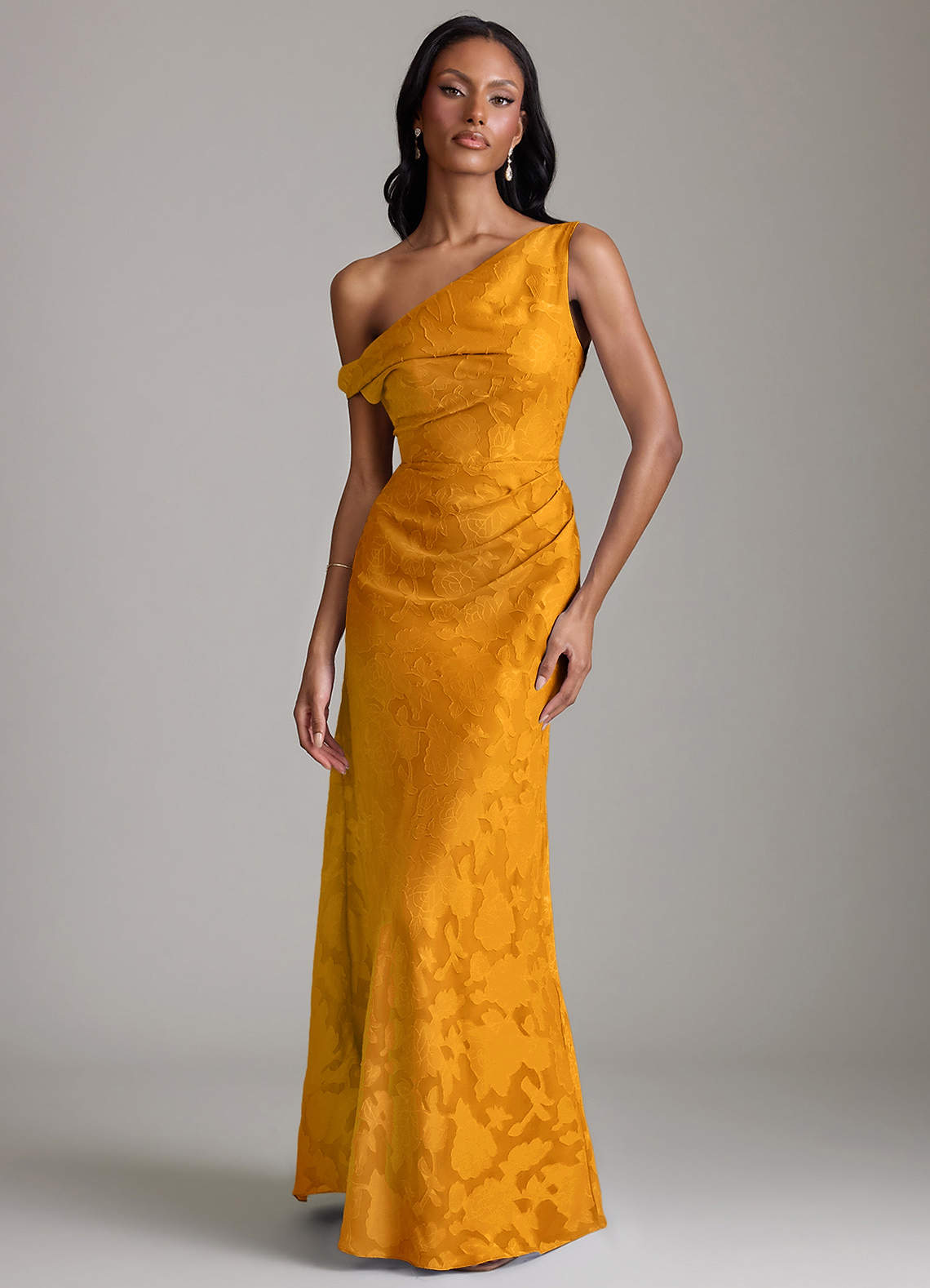 Abito Sirena in Burnout Floreale a Spalla Scoperta Caramello