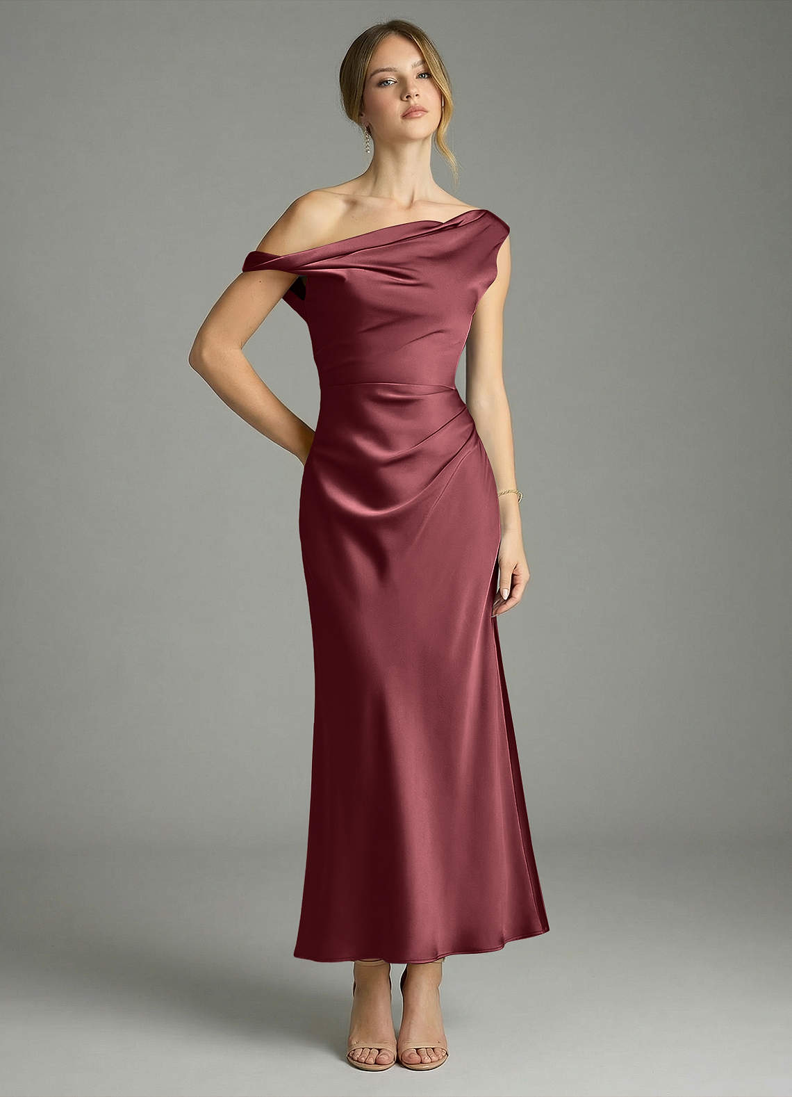 Abito Sirena in Raso Elasticizzato a Spalla Scoperta Merlot
