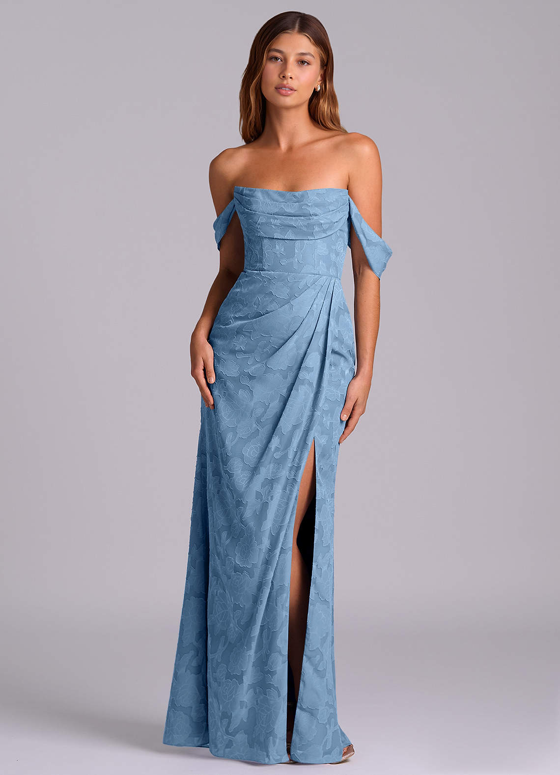 Abito Convertibile Sirena in Burnout Floreale a Spalla Scoperta Blu Acciaio